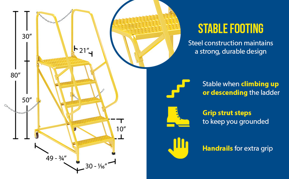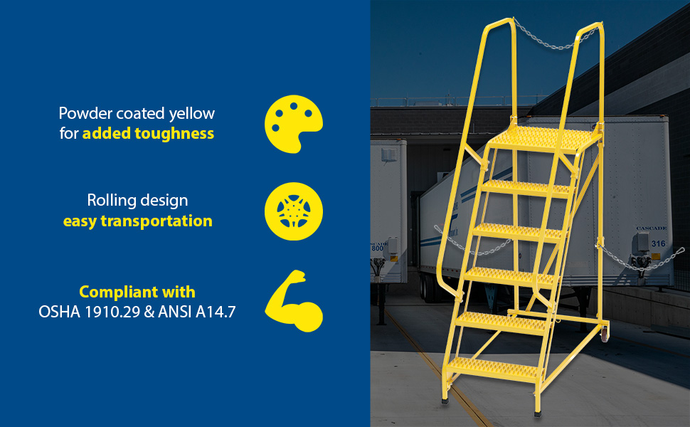 Semi-Trailer Access Ladders are for use getting into Semi-Trailers. Tilt the unit to allow for portability. Units roll on 4" poly-on-poly wheels. Constructed of square tubing framework which handles uniform capacities up to 350 lbs. Features 30" high removable hand railing, access chain, 21" deep top platform, and an industrial baked-in blue powder coat finish for toughness. Each step measures 24" wide by 7" deep and is spaced 10" apart. Climb Angle is 58 degrees. |
