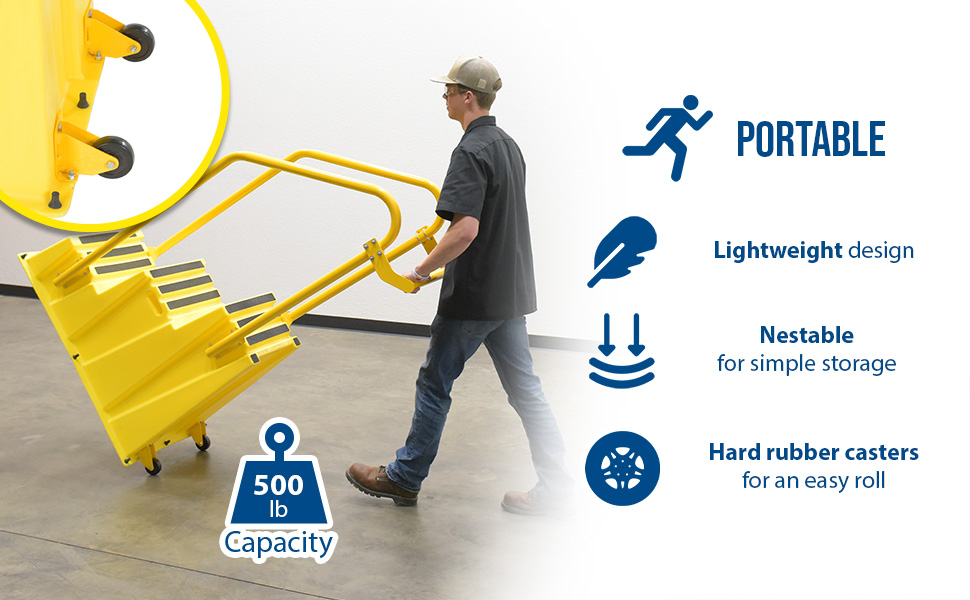 SPN-1-YL-HR-PO SPN-1-YL-HR-POPolyethylene Nestable with Handrails Casters 1 Step 500 Lb. Capacity YellowUniform Capacity (lb.): 500