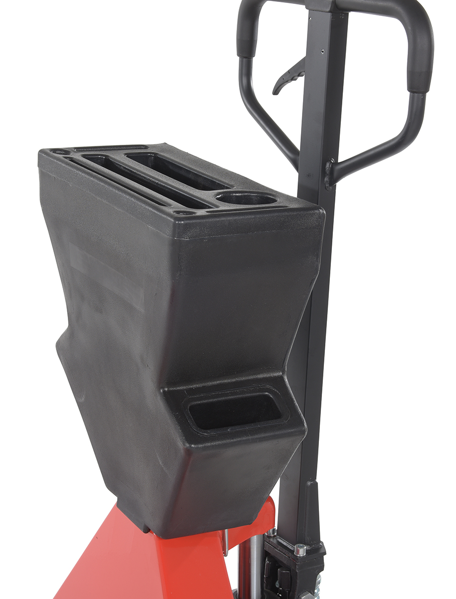 A pallet truck with a storage caddy is the perfect bundle of two innovative products. The pallet truck has an ergonomically friendly design with a limited pulling force required, while the caddy allows the user to be more organized and efficient. With a strong powder coated steel construction, the pallet truck moves easily between areas. Nose wheels are located on the front edge of each fork to assist in clean pallet entrance and exit. A molded plastic design allows the caddy to be durable throughout consistent daily use. Installation hardware and instructions included.