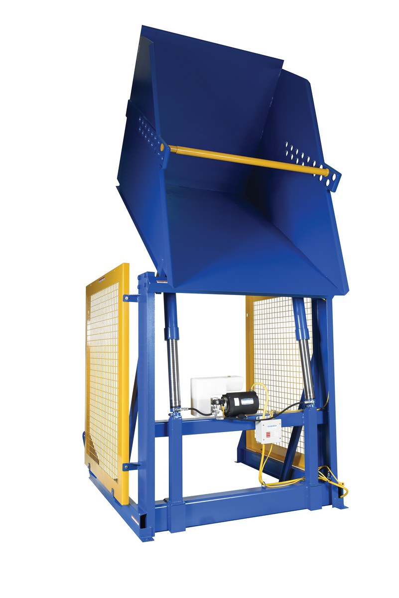 Designed for controlled dumping of material from boxes, crates, and other types of containers. Lowered height of only 3/8" allows for pallet truck loading and unloading. Retaining bar adjusts every 2" to accommodate a wide range of container heights. Each dump height has a hold down range, see chart. Maximum rotation is 135 degrees yielding a 45 degree dump angle. Unit may be stopped at any point during the dump cycle. Chute reach is 10" when fully rotated. Internal 2HP power unit and hand held control standard (5.5 HP power unit on 6,000 pound models). Protective mesh side screens included. Heavy-duty welded steel construction. Standard duty cycle equals maximum 15 starts per hour in a normal environment. Duty cycle is calculated by starts per hour or number of times "up" button is pushed. Jogging (bouncing of the chute) is NOT recommended.