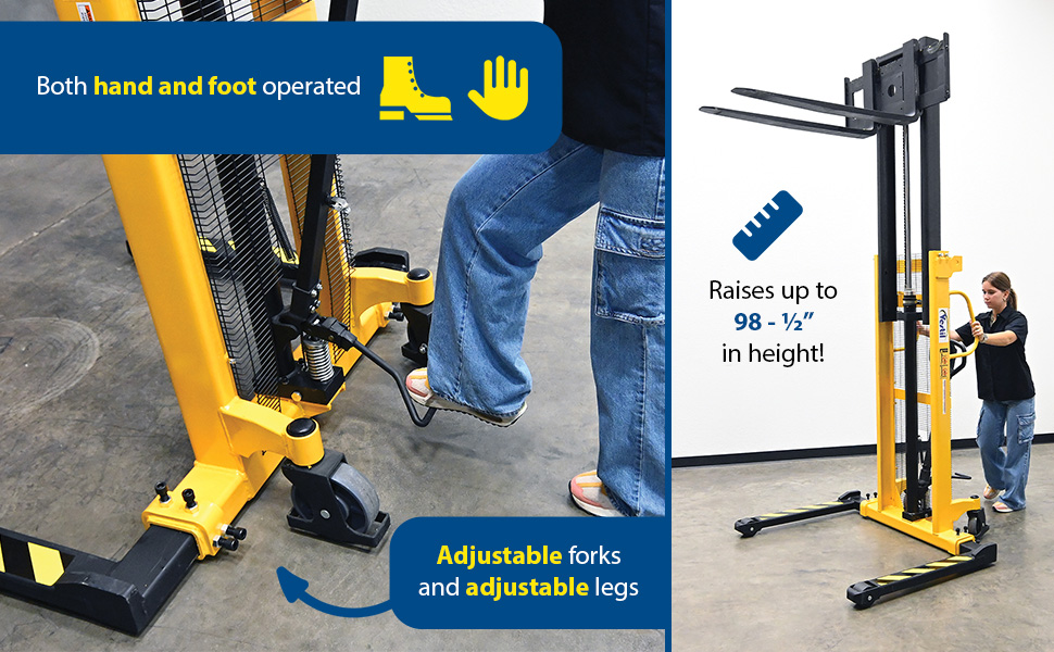 | Steel Manual Stacker Adjustable Forks/Legs 2,000 Lb. Capacity Black / Yellow | Uniform Capacity (lb.): 2,000 Service Range (in.): 2-1/8 to 63 | 860 |