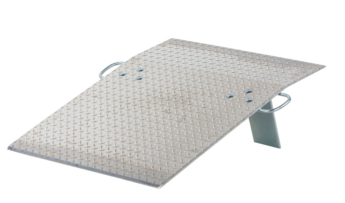 Designed for use with two wheel hand trucks. A convenient, safe and easy way to access loading docks from trucks. Lightweight and easily portable by just one person. Treadplate surface ensures skid-resistant safe traction. Locking legs secure the plate for safe loading and unloading. Complete with bolt-on zinc plated carrying handles and locking legs. The bend or crown is 11 degrees and located 9" from edge of dockplate.