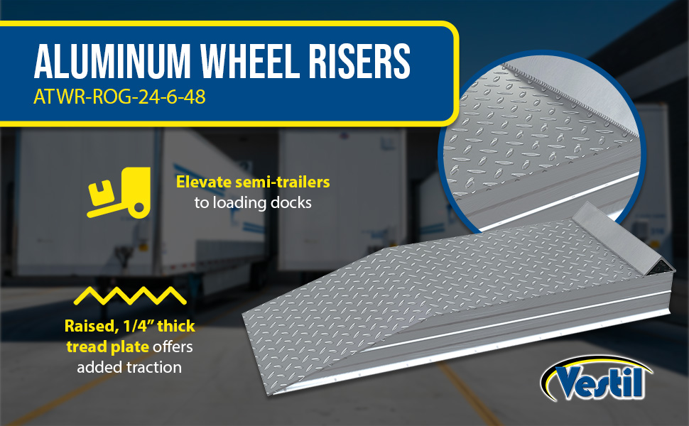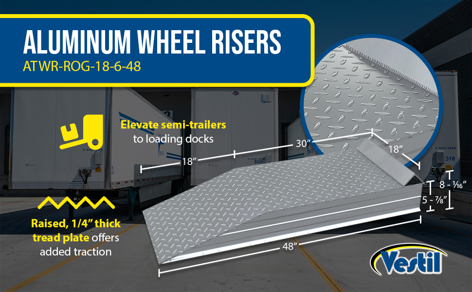 ATWR ApplicationElevate semi-trailers to loading docks for maximum serviceability during loading and unloading operations. Manufactured from heavy-duty aluminum tread plate for positive traction. Welded all aluminum construction. 30,000 lbs. capacity per pair (Sold Each). Wheel Risers are designed to raise the trailer for loading and unloading to facilitate compliance with OSHA/ANSI B56.1 part 3 sec 7 requirements for a maximum grade of ascending or descending loaded fork trucks.