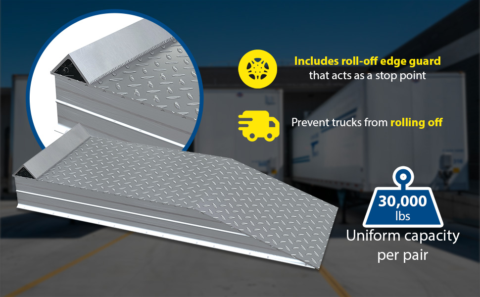 ATWR-ROG-18-10-60 ATWR-ROG-18-10-60Aluminum Tread Plate Wheel Riser with Roll Off Guard 60 In. x 18 In. x 12-1/16 In. 30000 Lb. Capacity SilverUniform Capacity (lbs.): 30,000