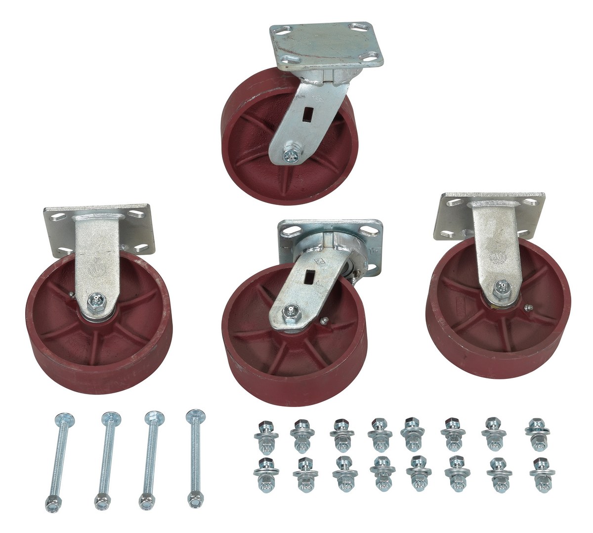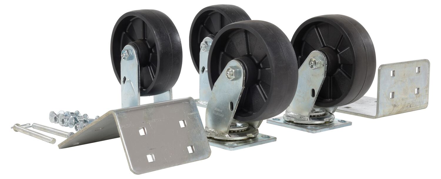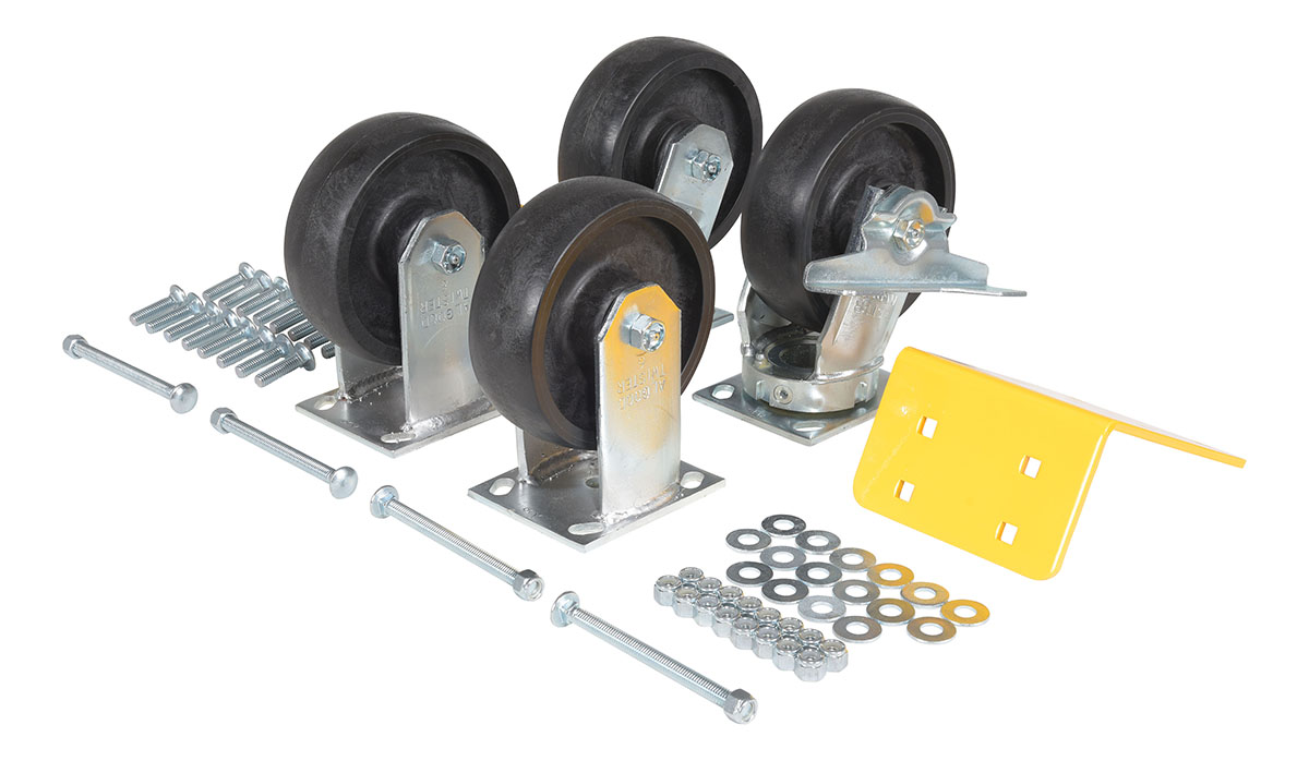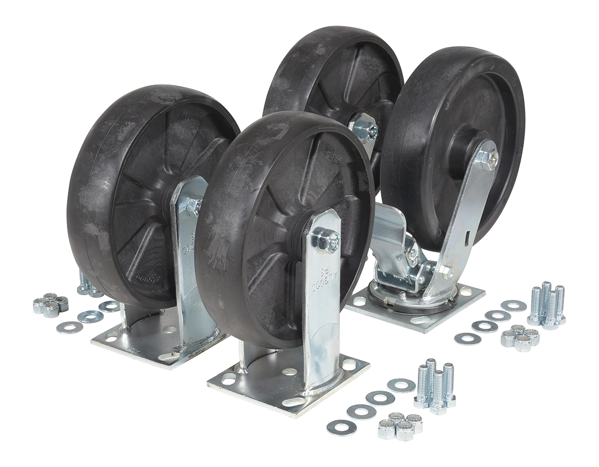 A: The mold on rubber and poly on steel casters with their soft tread are quiet and ideal for uneven floors. The glass filled nylon casters provide a smoother roll. The semi-steel and ductile steel casters are the most durable. Your sales associate can help you match the capacity and size of the caster kits to your hopper.