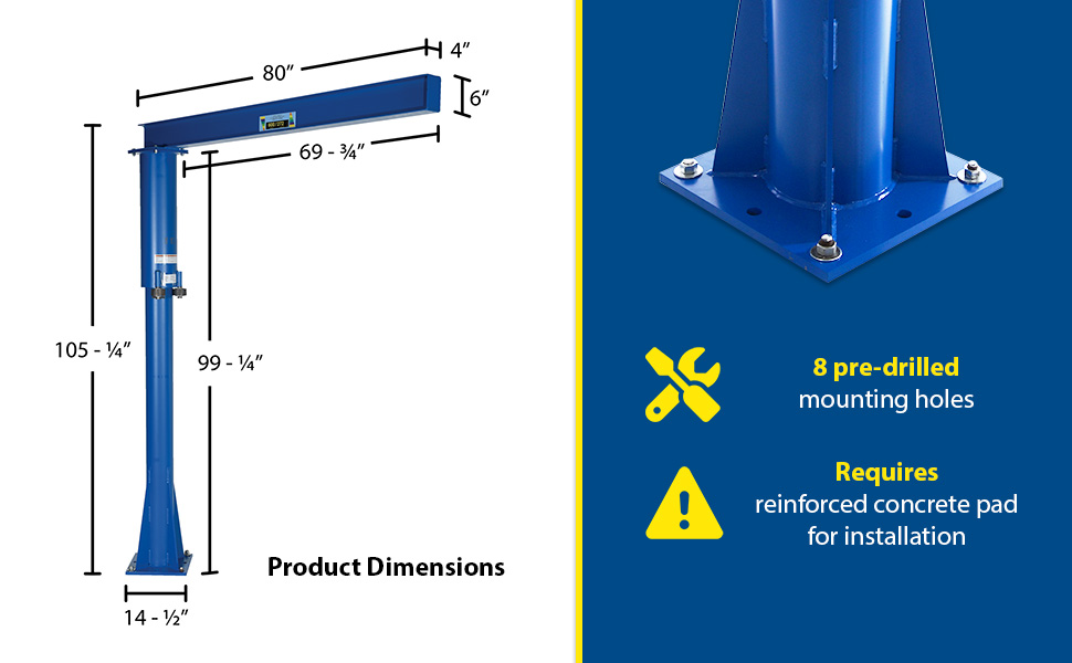 | JIB-FM-6 | POPULAR | ![]() | 1 Year Limited Warranty | Steel Floor Mounted Jib 80 In. I-Beam 600 Lb. Capacity Blue | Uniform Capacity (lb.): 600 Under I-Beam to Ground Length (in.): 99-1/4 | 454 |