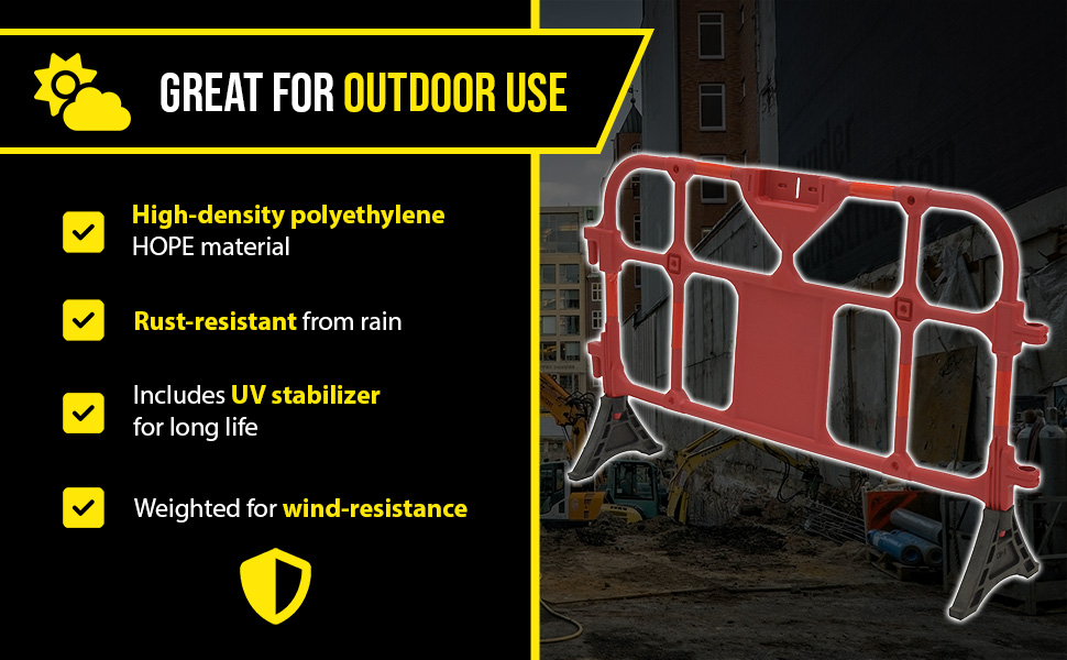 • Plastic handrail barrier has non-removable feet that come pre-filled with sand for weight ballast