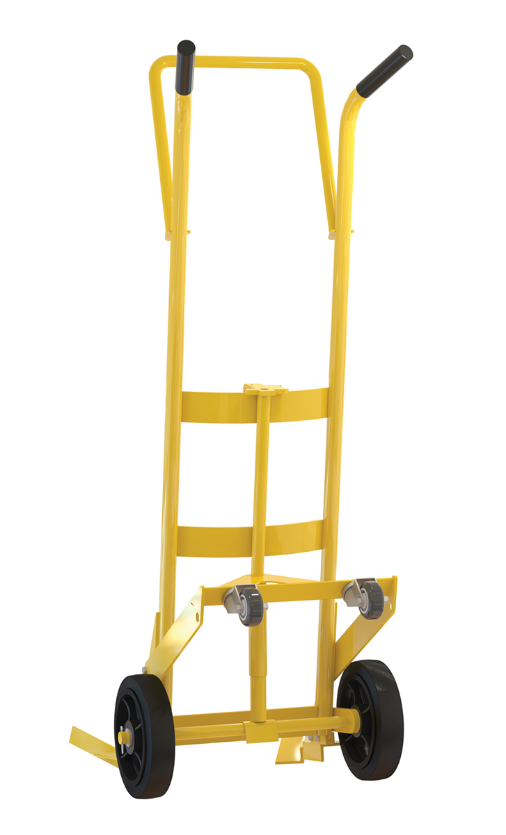 Designed for moving 55 gallon steel or plastic drums. Features a spring mechanism, which allows for easier tilting of fully-loaded drums. Four-wheel design for easier drum transportation when tilted. Top loop handle allows for easier control when moving. Drum is secured to truck with an adjustable height drum hook bar. Removable drum hook bar includes built-in bung nut wrenches. Capacity is 1,000 pounds. Steel construction with powder coat finish.