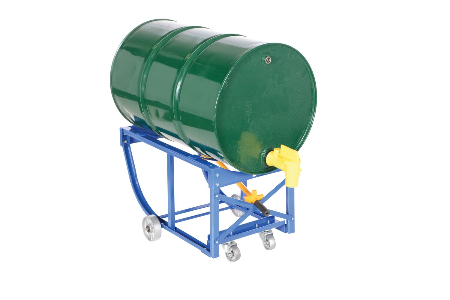Specially designed to maneuver 55 gallon drums for emptying. Manually rotate and position drum to meet the needs of each individual user. Steel construction with a painted finish for added toughness. Model RDC-60-NC has all the functionality of the economy drum cart, however no casters are included. Caster type utilized on additional models include; polyurethane, polyolefin, and steel. Handle includes bung nut wrench and a built-in drum tipper to assist with liquid drainage.