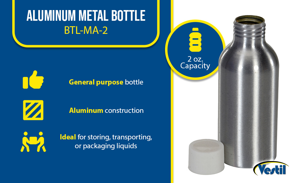 | BTL-MA-2 | ![]() | 30 Days Limited Warranty | Aluminum Metal Bottle 2 Oz Silver | Uniform Capacity (oz.): 2 Inside Diameter of Opening (in.): 25/32 | 2 | ||