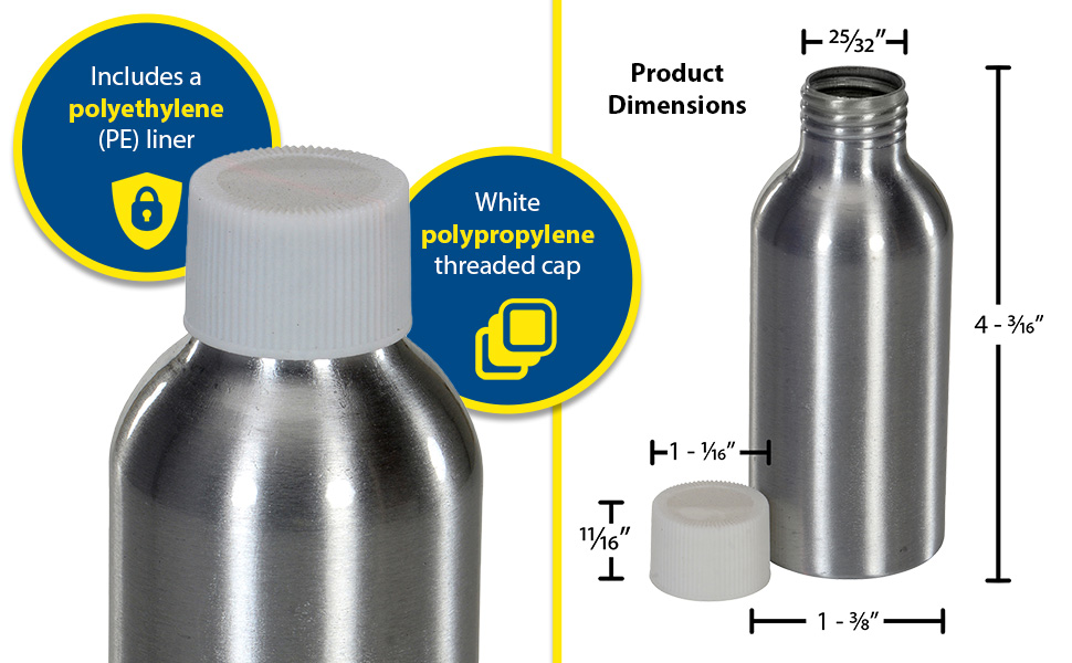 | BTL-MA-4 | ![]() | 30 Days Limited Warranty | Aluminum Metal Bottle 4 Ounces Silver | Uniform Capacity (oz.): 4 Inside Diameter of Opening (in.): 25/32 | 2 | ||