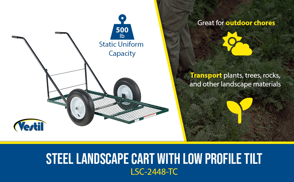 | LSC-2448-TC | ![]() | 30 Days Limited Warranty | Steel Landscape Cart with Low Profile Tilt 53 In. x 24 In. x 45 In. 500 Lb. Capacity Green | Uniform Static Capacity (lb.): 500 Deck Width (in.): 24 | 42 | ||