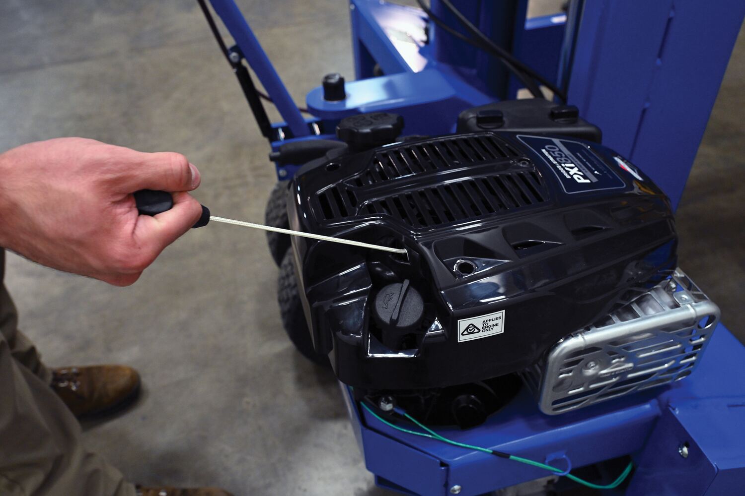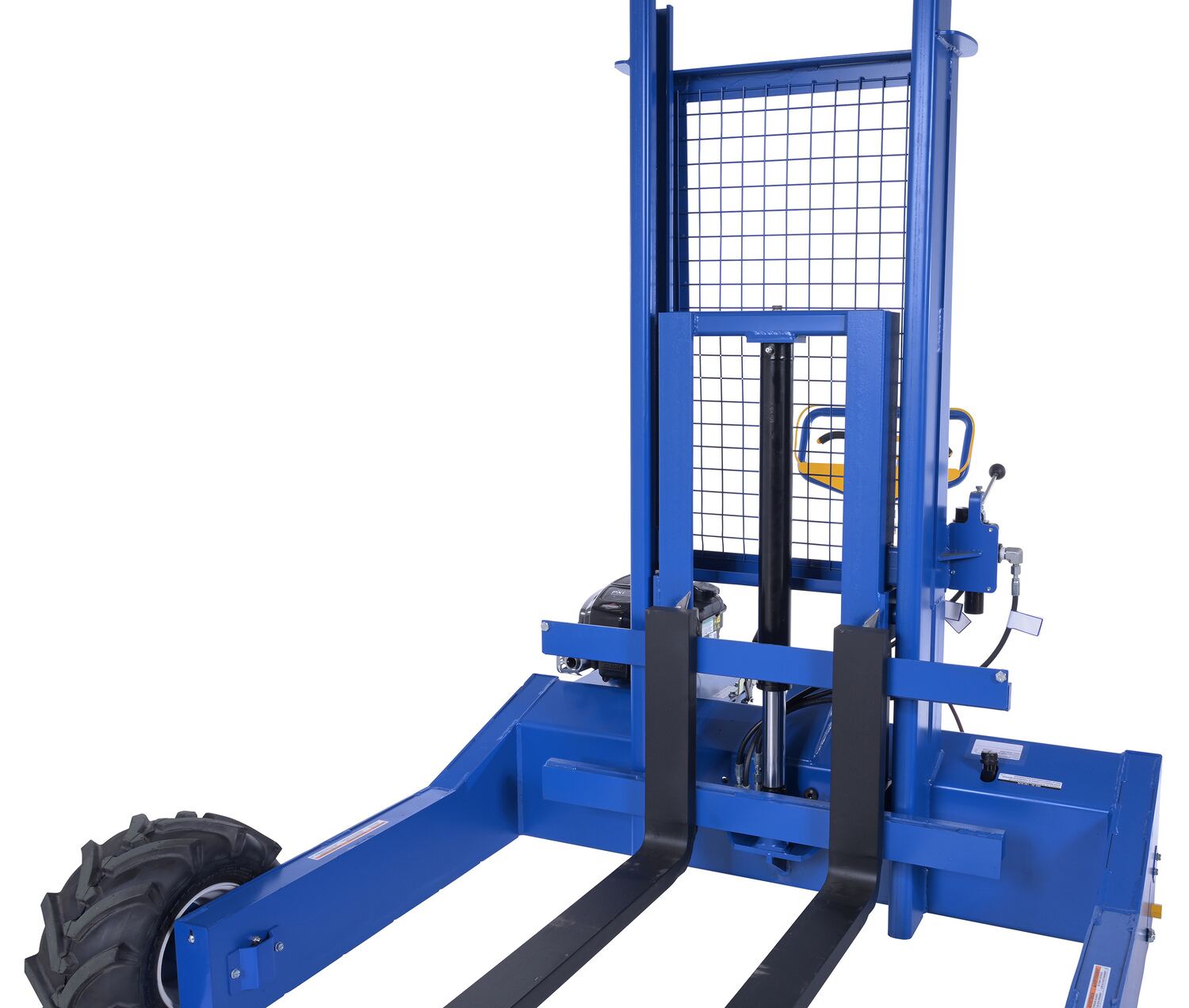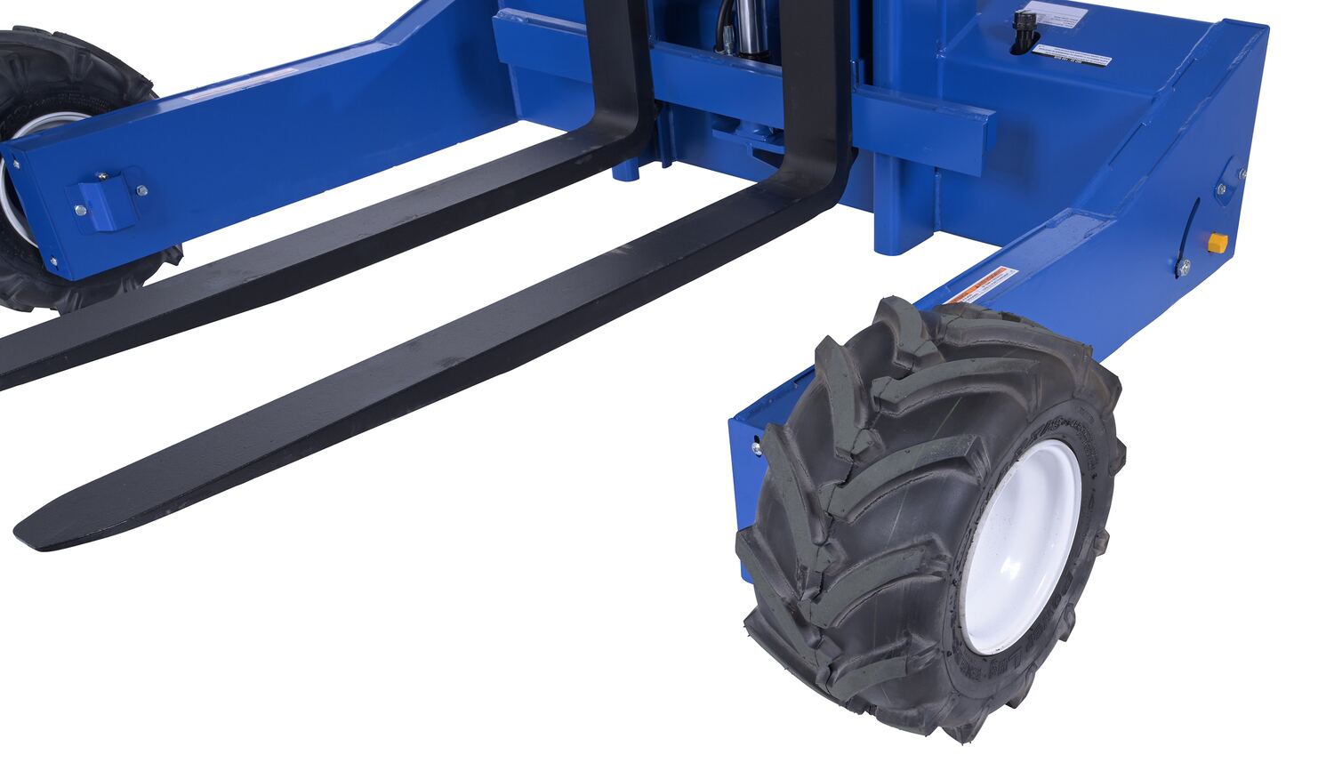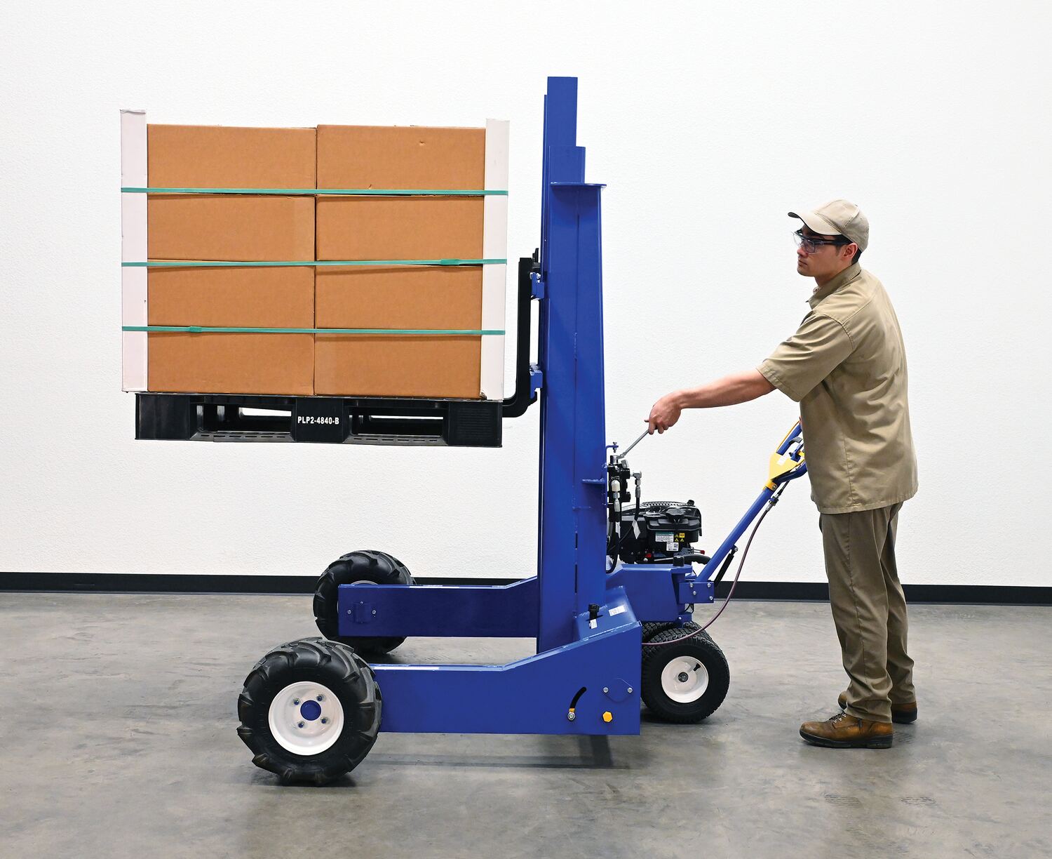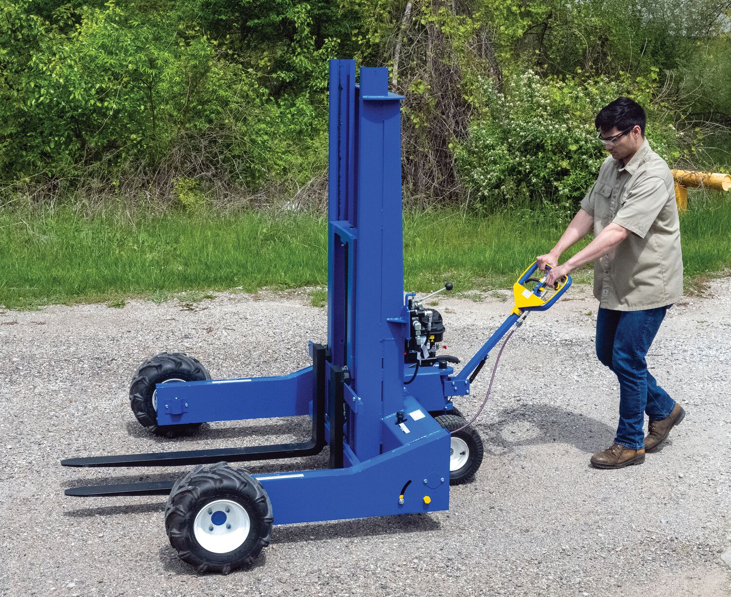Steel 190CC Gas Powered Drive and Lift All-Terrain Pallet Truck 48 In. Long Adjustable Width Forks 3,500 Lb. Capacity BlueAll terrain pallet truck with gas-powered traction drive system. Great for moving heavy loads over rough terrain. Powered by a Briggs & Stratton 6HP gas-powered engine for both the power traction drive and fork lift/lower. Handle with forward reverse speed control and dead man safety switch. Approximate walking speed is 3 mph. Hydrostatic transmission with hand-operated forward and reverse selection. Powered fork raise and lower control lever. Usable width between outriggers is 52". Pneumatic steer wheels are 13" diameter x 4" wide each. Wheels include sealed bearings for outdoor use. Comply with ASME B56.1-2004.