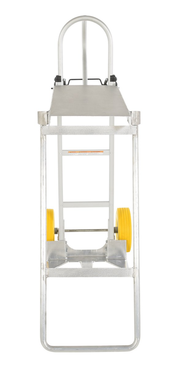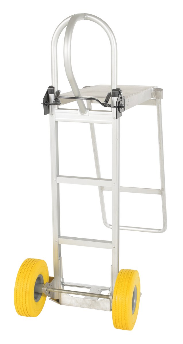 This lightweight aluminum hand truck features an integral work bench. Work bench conveniently folds flat for storage. Now a sturdy work bench can be moved to where it is needed most. Provides for a more comfortable and ergonomically correct work position. P-handle design allows for easy maneuverability.