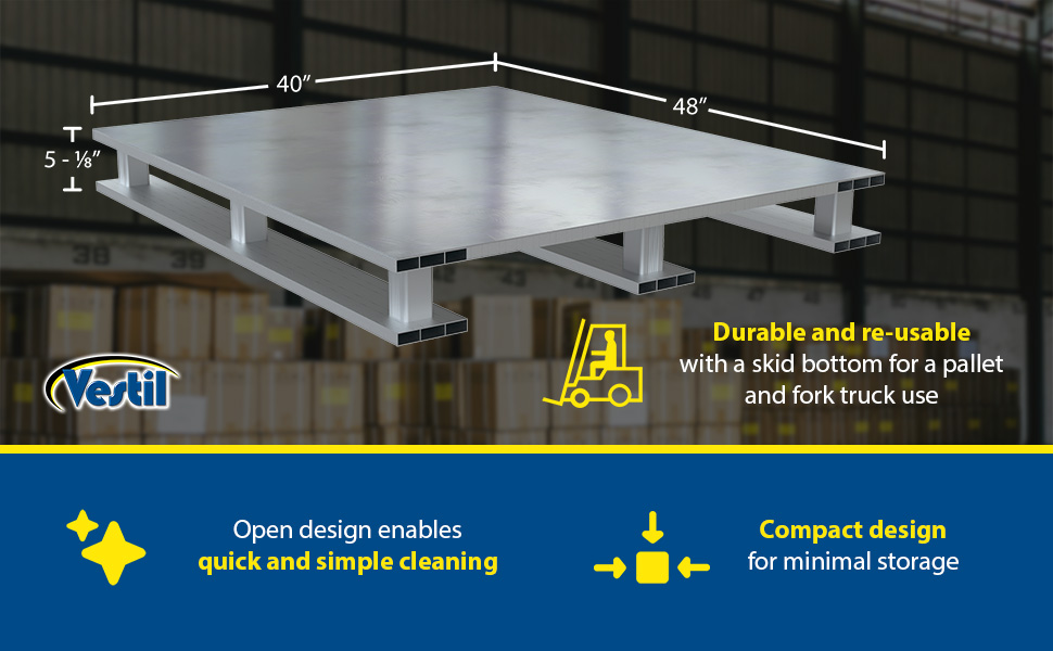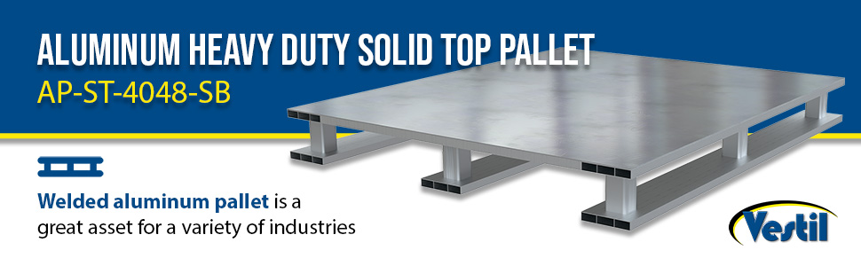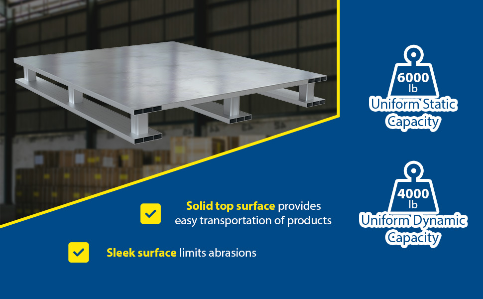 Aluminum Solid Top with Skid Bottom 40 In. x 48 In. 6000 Lb. Capacity SilverA welded Aluminum pallet is a great asset for a variety of industries. The open design enables quick and simple cleaning. This pallet is durable and re-usable with a skid bottom entry for pallet and fork truck use. Large static capacity allows for load both big and small.