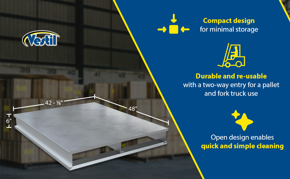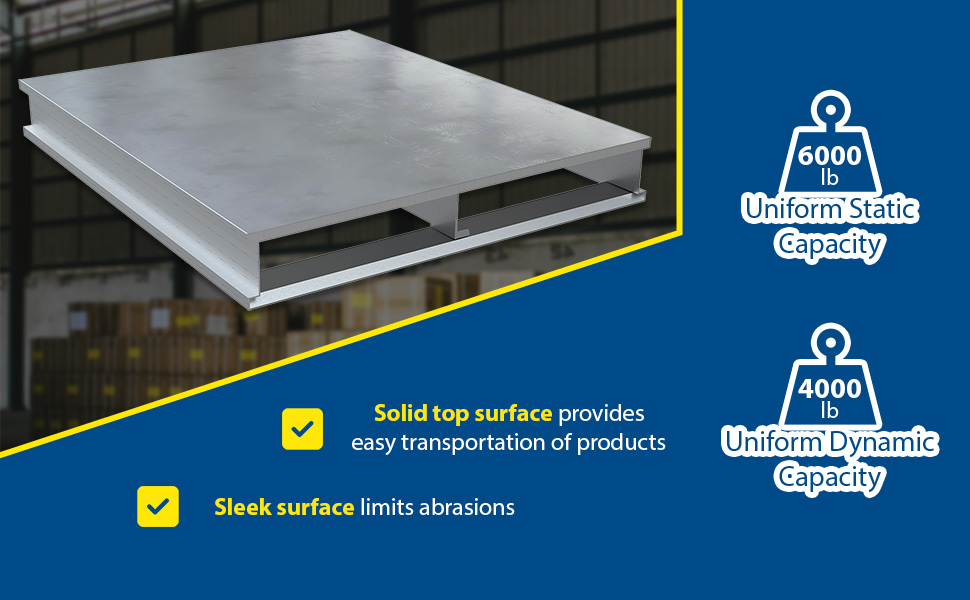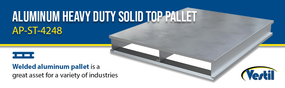 Aluminum Heavy Duty Solid Top Pallet 48 In. x 42-1/8 In. x 6 In. 6000 Lb. Capacity SilverA welded Aluminum pallet is a great asset for a variety of industries. The open design enables quick and simple cleaning. This pallet is durable and re-usable with a two-way entry for pallet and fork truck use. Large static capacity allows for load both big and small.