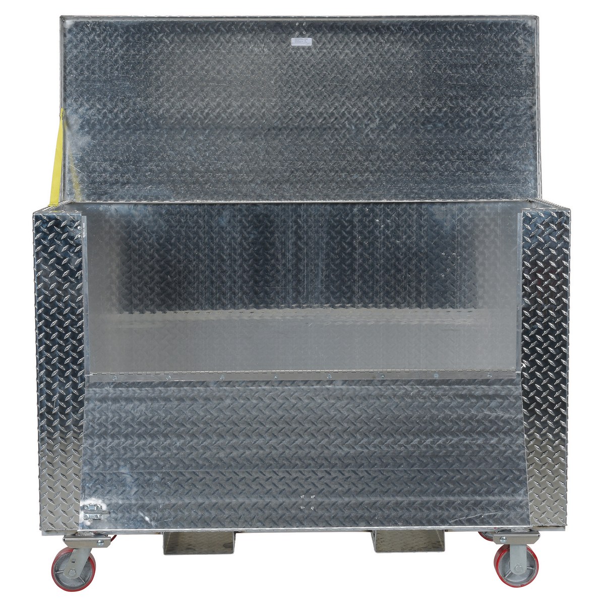 Aluminum Portable Tool Box with Fold Down Front Door with Casters and Fork Pockets 25-7/8 In. x 61-1/4 In. x 44-11/16 In. 2500 Lb. Capacity SilverThe Aluminum portable toolbox is excellent for storing and transporting equipment. The heavy duty welded aluminum tread plate construction is designed to tolerate the toughest of environments. Additional features also include ergonomically friendly carrying handles on each end for smooth manual transporting and a hinged lid which includes a lockable double hinged hasp for added security. Casters are included for simple portability between work areas. Fork pockets are attached to the units underbelly for lifting and maneuvering between areas.