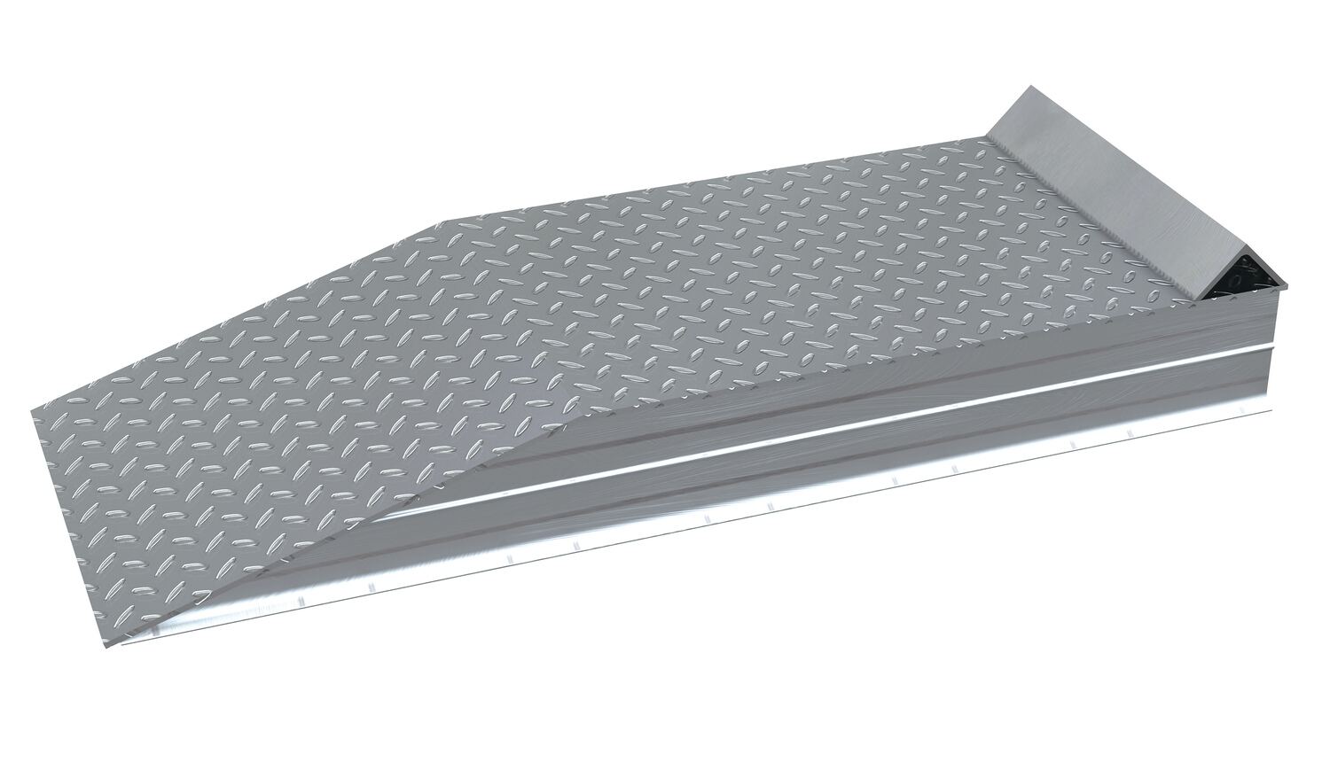 Aluminum Tread Plate Wheel Riser with Roll Off Guard 102 In. x 18 In. x 6 In. 30000 Lb. Capacity SilverA standard wheel riser is a great asset to have available when working in the shipping and receiving industries. But, this wheel riser is more than standard. With an aluminum construction, this unit includes a roll off edge guard that acts as a stop point. This allows the user to safely mount the wheel riser without the fear of going too far. The raised tread surface gives added traction throughout the ascending and descending action.