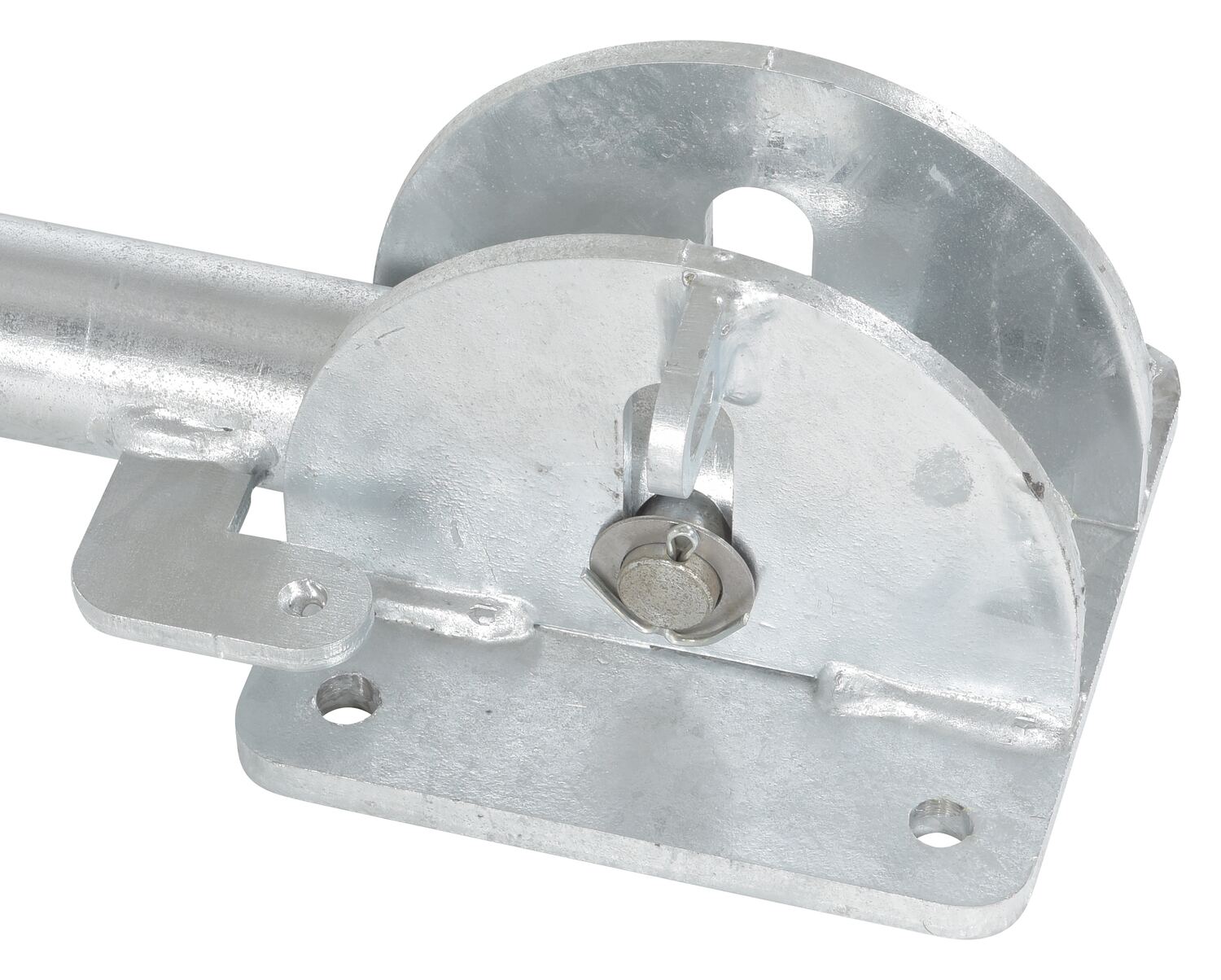 Steel Fold-Down Galvanized Bollard 42 In. SilverFolding steel barrier post for parking control and security. This folding bollard is locked in the raised position with a padlock (padlock not included). When padlock is removed, bollard may be lowered to ground to allow for access. Steel construction.