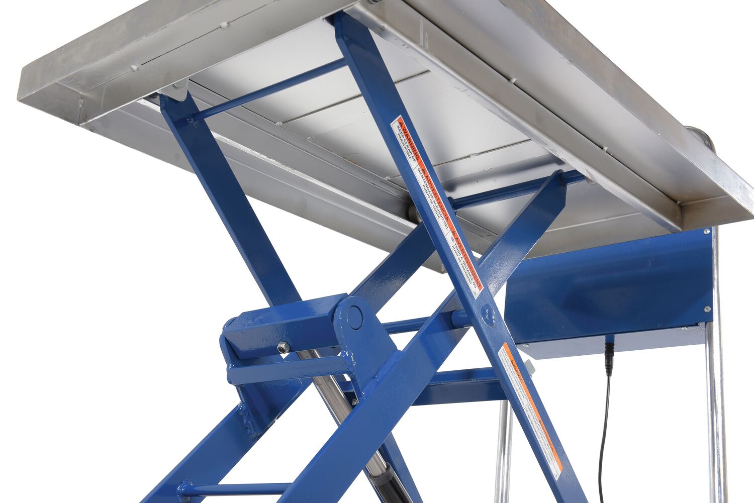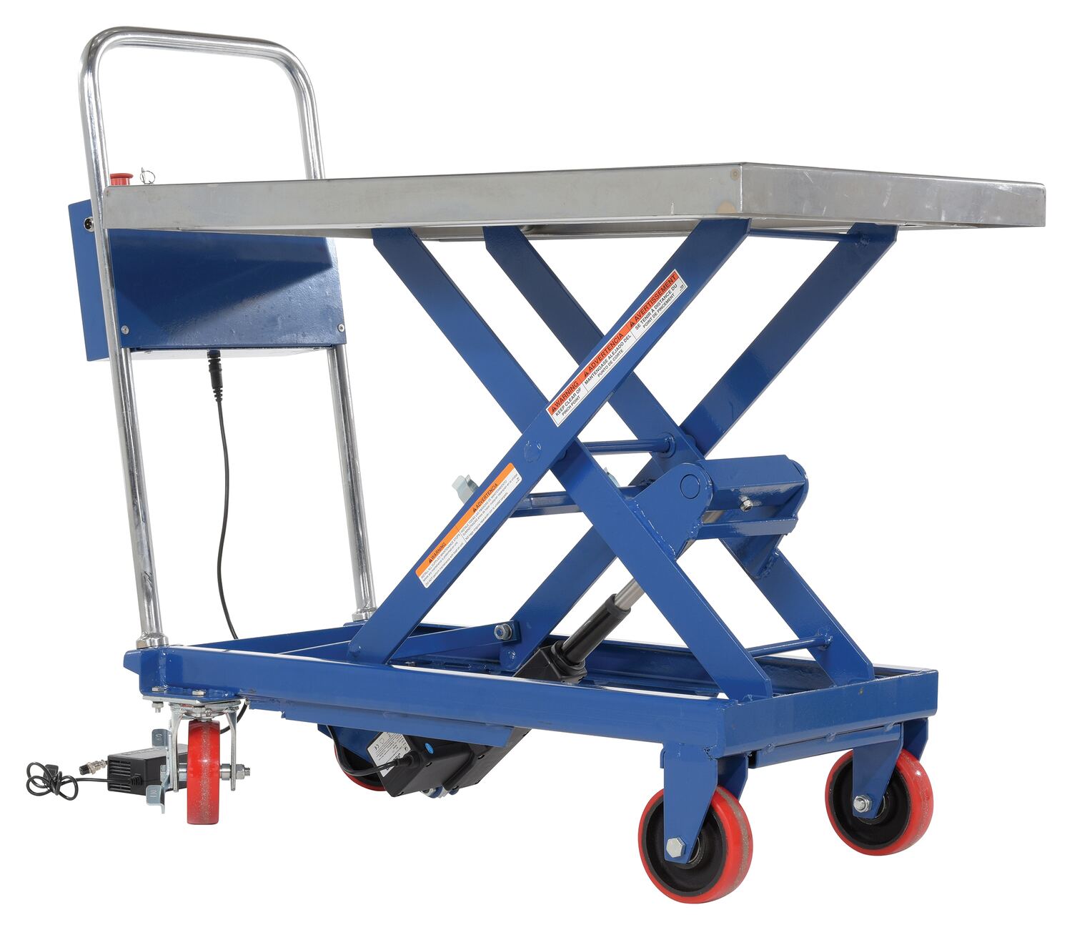 Steel Linear Elevating Cart 23-5/8 In. x 35-1/2 In. 400 Lb. Capacity Blue/SilverThe linear actuated elevating cart transports materials from workstation to workstation with ease. The platform is raised and lowered with an electric linear actuator for precise positioning. Linear actuator will not allow platform to drift down - a common problem with hydraulic carts. This linear actuated cart is powered by (2) 12v AGM batteries and feature bench type charger. Emergency stop button standard on control box. The units rolls smoothly on two rigid and two swivel casters. Features an internal safety velocity fuse in each cylinder.