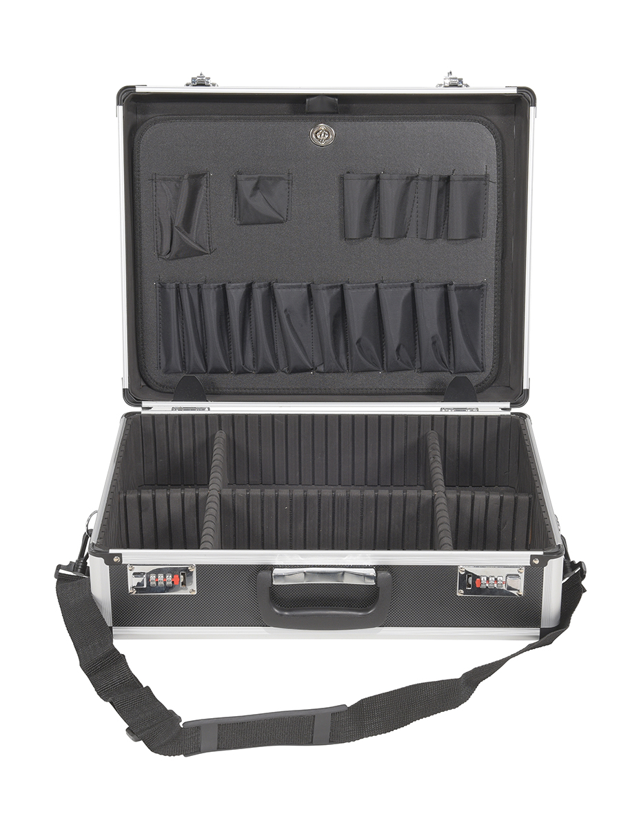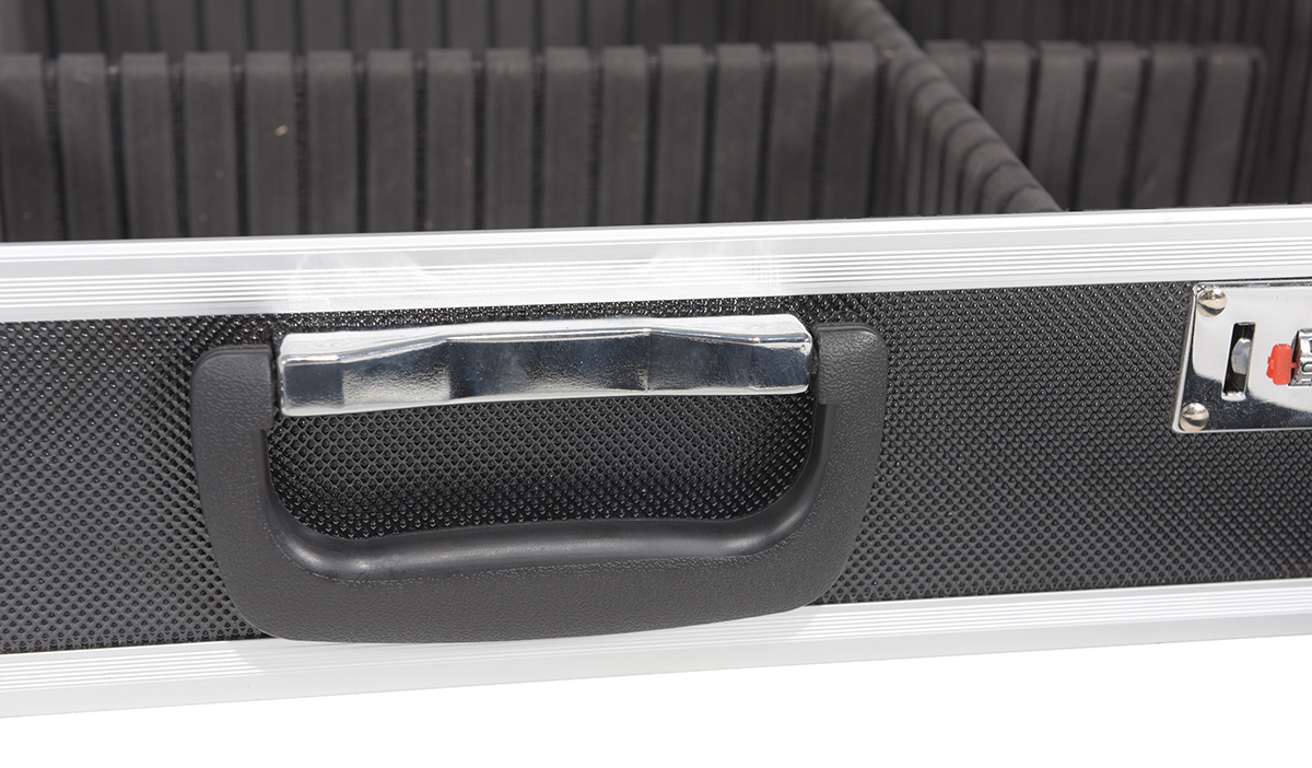 Whether it's on the go or just for around the house, a sleek carrying case is great for storing items. With a variety of interior panels, items of multiple sizes can be easily sheltered. Panels can be moved and adjusted to create a customized interior. Rugged construction with enhanced corners keeps enclosed items secure during transport. An included combination lock allows the contents to consistently be safe.