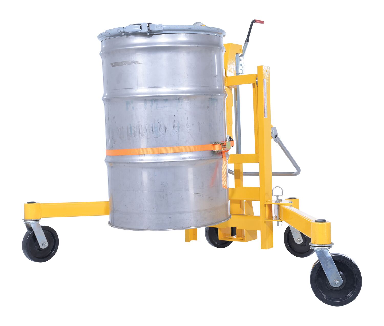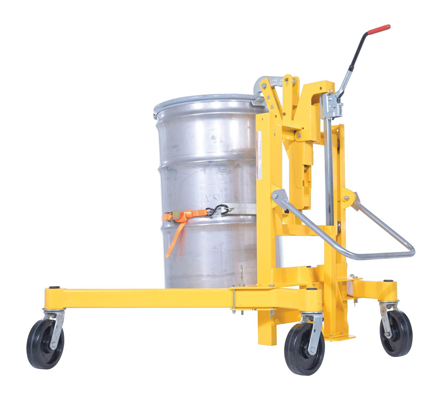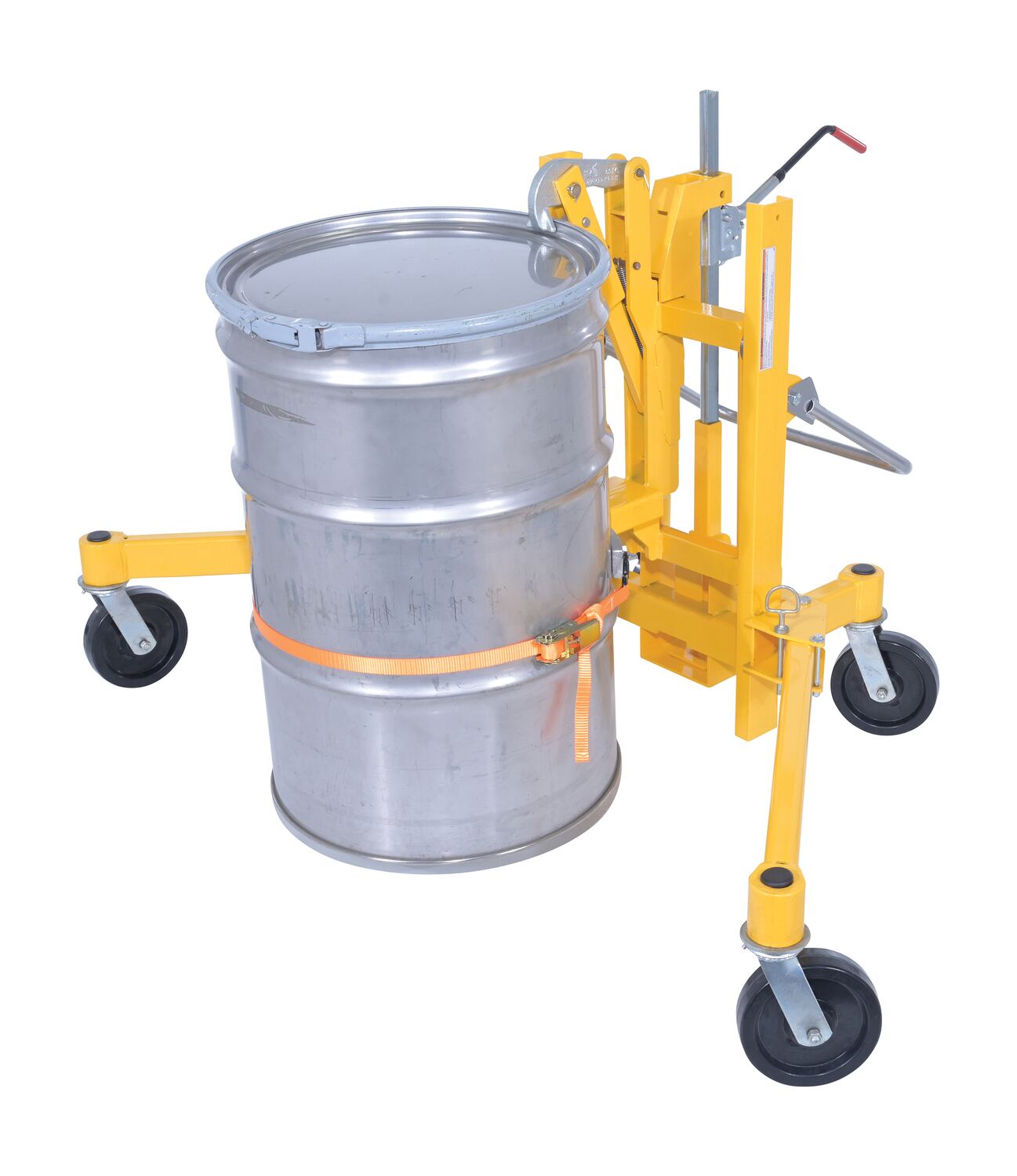 Steel Economical Ratchet Drum Transporter 55 Gallon 800 Lb. Capacity YellowUnique portable economical drum transporter is designed to lift and transport drums with a top lip. Steel jaw securely grips the top lip of the drum. Hand ratchet lift mechanism. Straddle legs rotate for access to drums on pallets. The push handle folds down for easy access to the ratchet.