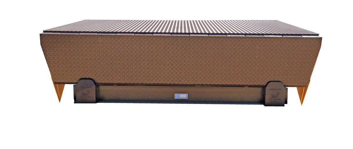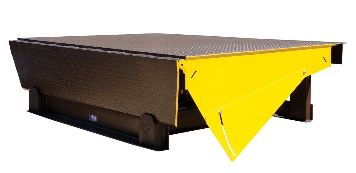 Steel Electric Hydraulic Dock Leveler 86"W x 62"L x 24"D Pit Dimensions, 20000 Lb. Capacity Brown/YellowThe electric hydraulic dock leveler is ideal for high usage dock areas. The hydraulic design is state of the art and consists of a single button operation. The operator pushes and holds the "raise" button which activates the hydraulic pump and raises the deck. When the deck reaches the raised position the lip automatically extends. The operator releases the "raise" button and the deck descends to rest on the trailer. The control box includes a red emergency stop button standard. When the truck pulls away, the deck descends to full down position, trips the limit switch and returns automatically to the level cross traffic position. It includes telescopic steel toe guards on both sides, flush with platform edge and includes two (2) laminated bumpers.