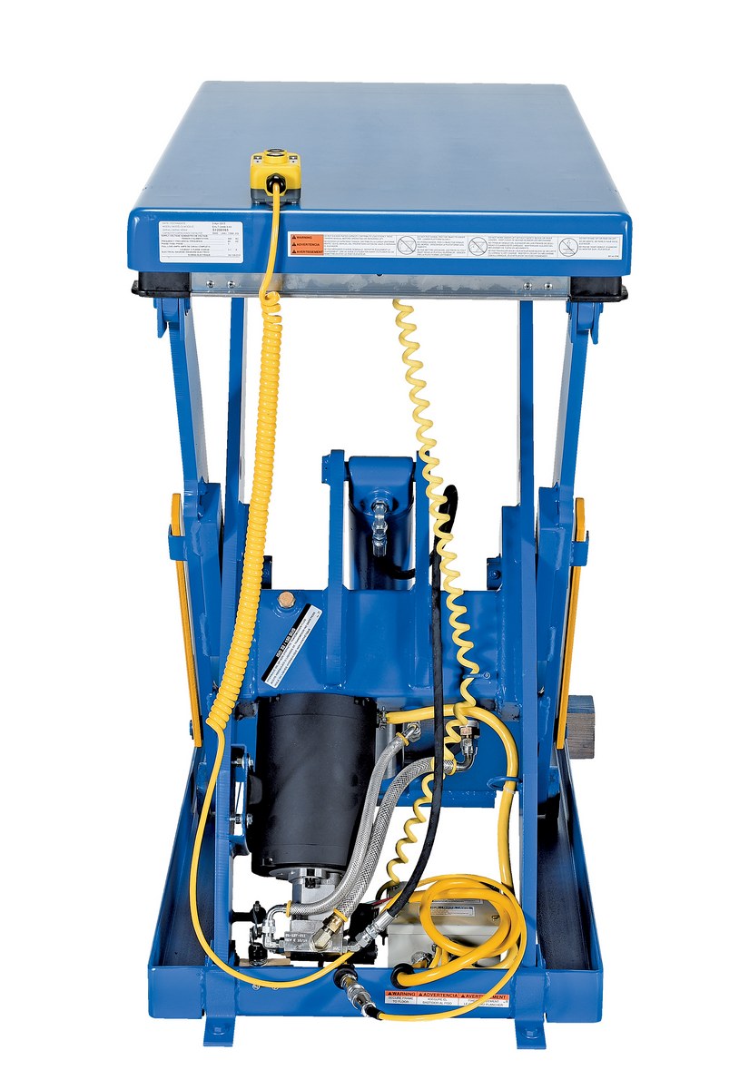 The electric hydraulic scissor lift table is used by all types of manufacturing and warehouse facilities. Safety features include a patented pinch point perimeter toe guard to protect pinch points while lowering the table, fused push button control, internal safety velocity fuse to maintain platform height in the event of hose or fitting failure, integral maintenance prop, adjustable upper travel limit switch to stop the table at maximum height, and displacement-style hydraulic cylinders for maximum strength. It also features a pressure plated pump, manifold system, and state-of-the-art lifetime lubricated bearings. The standard 56 frame electric motor is a fully enclosed with additional voltage options available. Contact factory if platform dimensions are crucial.