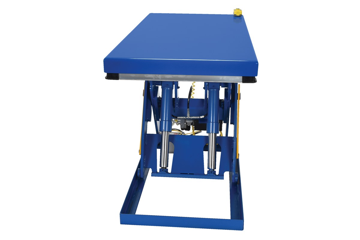 The electric hydraulic scissor lift table is used by all types of manufacturing and warehouse facilities. Safety features include a patented pinch point perimeter toe guard to protect pinch points while lowering the table, fused push button control, internal safety velocity fuse to maintain platform height in the event of hose or fitting failure, integral maintenance prop, adjustable upper travel limit switch to stop the table at maximum height, and displacement-style hydraulic cylinders for maximum strength. It also features a pressure plated pump, manifold system, and state-of-the-art lifetime lubricated bearings. The standard 56 frame electric motor is fully enclosed with additional voltage options available. Contact factory if platform dimensions are crucial.