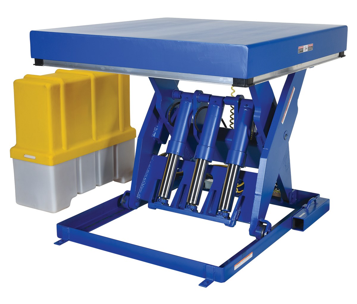 Steel Electric Hydraulic Lift Table 48 In. x 48 In. 10000 Lb. Capacity BlueThe electric hydraulic scissor lift table is used by all types of manufacturing and warehouse facilities. Safety features include a patented pinch point perimeter toe guard to protect pinch points while lowering the table, fused push button control, internal safety velocity fuse to maintain platform height in the event of hose or fitting failure, integral maintenance prop, adjustable upper travel limit switch to stop the table at maximum height, and displacement-style hydraulic cylinders for maximum strength. It also features a pressure plated pump, manifold system, and state-of-the-art lifetime lubricated bearings. The standard 56 frame electric motor is fully enclosed with additional voltage options available. Contact factory if platform dimensions are crucial.
