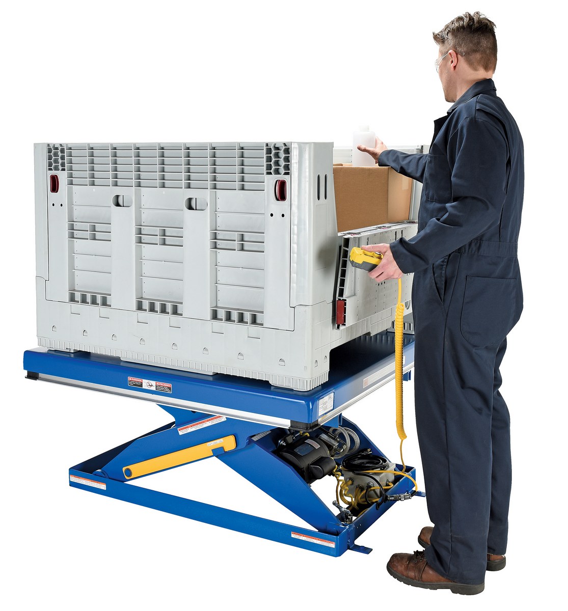 Steel Electric Hydraulic Lift Table 48 In. x 48 In. 2000 Lb. Capacity BlueThe electric hydraulic scissor lift table is used by all types of manufacturing and warehouse facilities. Safety features include a patented pinch point perimeter toe guard to protect pinch points while lowering the table, fused push button control, internal safety velocity fuse to maintain platform height in the event of hose or fitting failure, integral maintenance prop, adjustable upper travel limit switch to stop the table at maximum height, and displacement-style hydraulic cylinders for maximum strength. It also features a pressure plated pump, manifold system, and state-of-the-art lifetime lubricated bearings. The standard 56 frame electric motor is fully enclosed with additional voltage options available. Contact factory if platform dimensions are crucial.