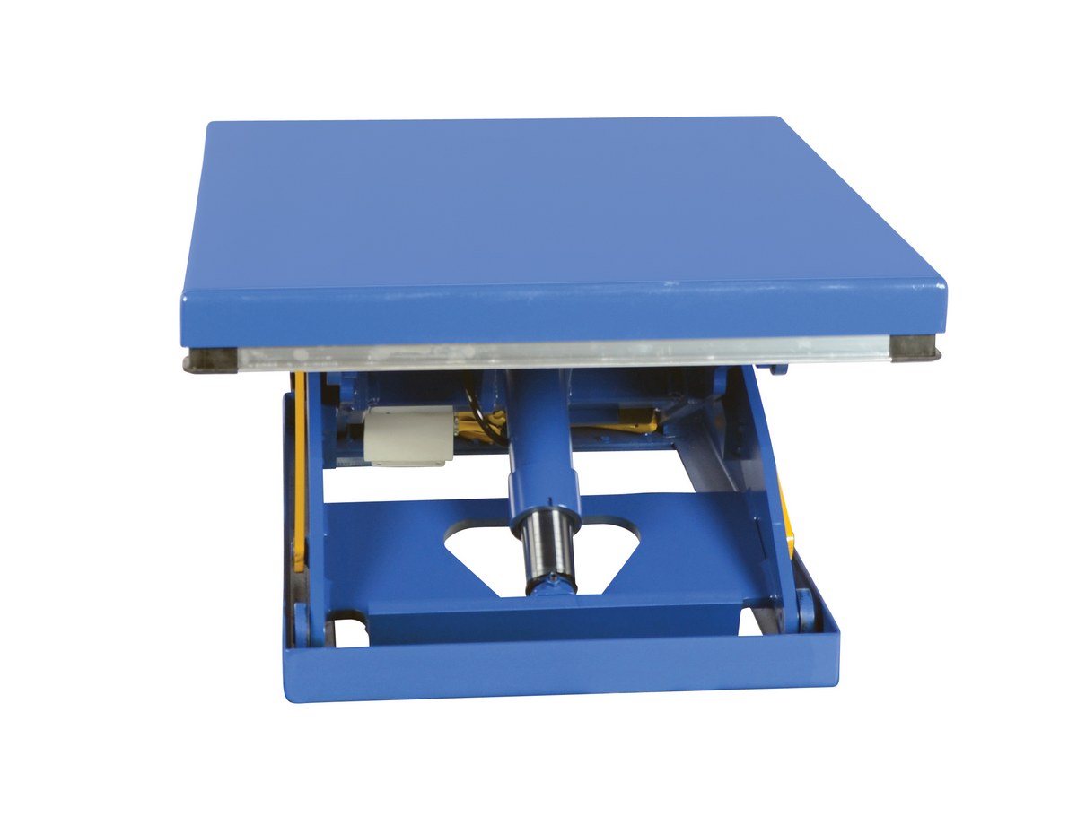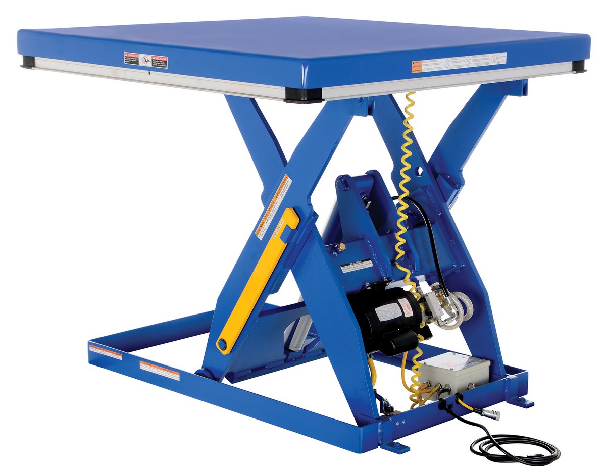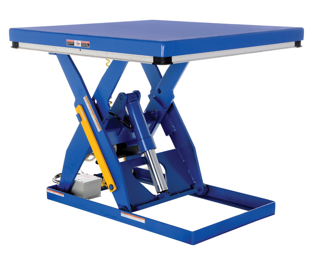 Steel Electric Hydraulic Lift Table 48 In. x 48 In. 3000 Lb. Capacity BlueThe electric hydraulic scissor lift table is used by all types of manufacturing and warehouse facilities. Safety features include a patented pinch point perimeter toe guard to protect pinch points while lowering the table, fused push button control, internal safety velocity fuse to maintain platform height in the event of hose or fitting failure, integral maintenance prop, adjustable upper travel limit switch to stop the table at maximum height, and displacement-style hydraulic cylinders for maximum strength. It also features a pressure plated pump, manifold system, and state-of-the-art lifetime lubricated bearings. The standard 56 frame electric motor is fully enclosed with additional voltage options available. Contact factory if platform dimensions are crucial.