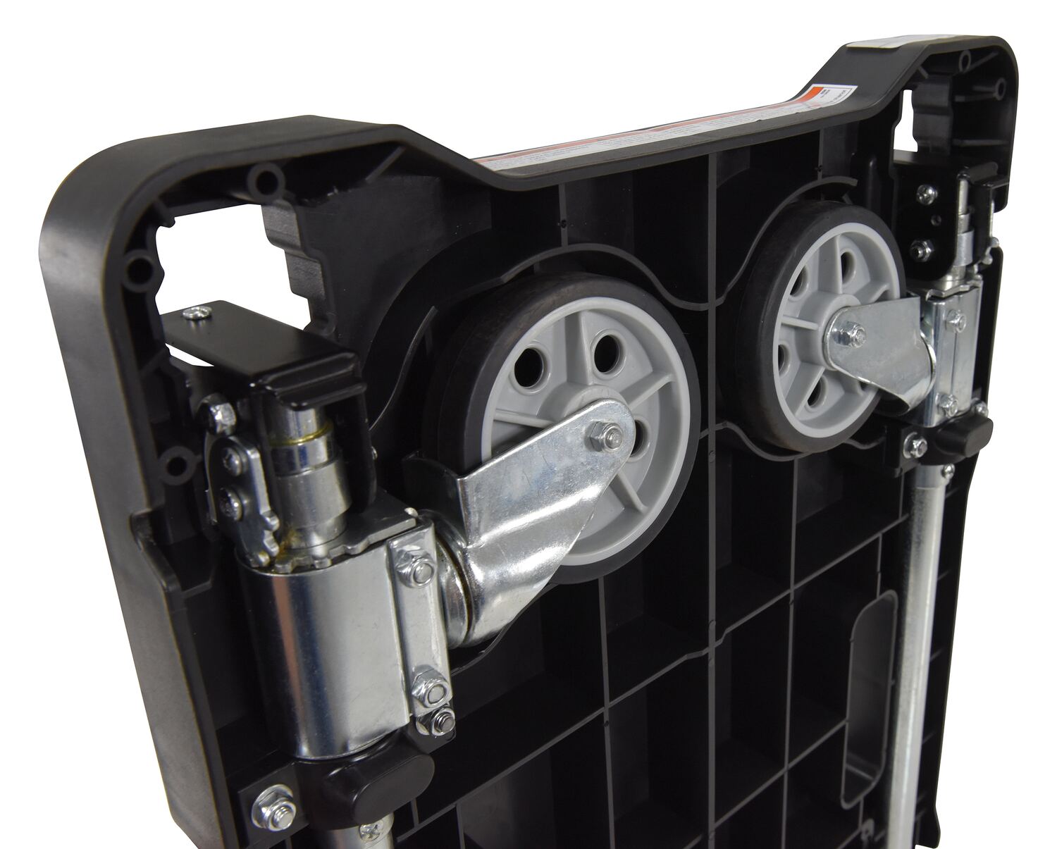 Plastic Fold Flat Cart 26-3/4 In. x 16-1/4 In. 300 Lb. Capacity BlackThis unique fold-flat plastic cart folds completely flat for storage - telescopic handle folds down and casters fold up. Handle is adjustable to three different heights and features a cushion grip for comfort. Deck includes non-slip rubber grips and hand holes for easy carrying. Cart rolls on poly casters and is constructed from plastic, steel and aluminum components.