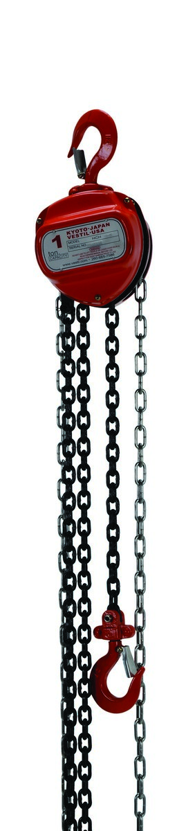 Steel Manual Chain Hoist 10 Ft. Lift 2,000 Lb. Capacity OrangeThis portable, lightweight hand Chain Hoist is durable and easy to operate. Compact design and low headroom allow installation in confined areas. Enclosed double ratchet pawls with self adjusting disc brake standard. Designed with a safety factory four (4) times rated capacity. Individually tested at 150% rated capacity. Features black chain tempered to ISO 3077, pull chain, hardened two-stage gears and forged steel upper and lower hooks with safety latches. Constructed of high quality steel components ideal for industrial applications.