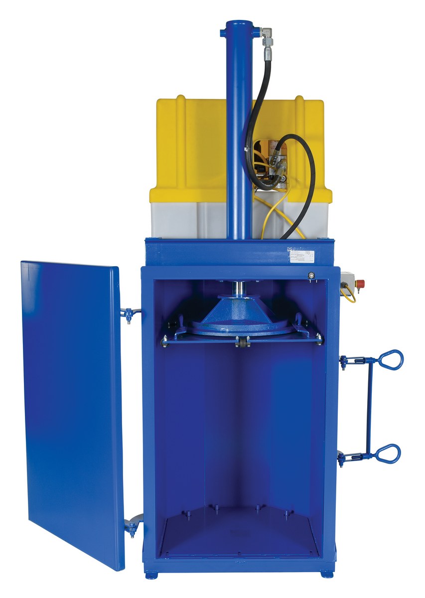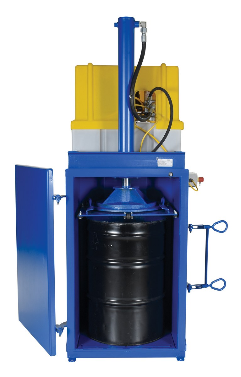 Steel Hydraulic Drum Crusher and Compactor 460 Volt Three Phase 38,000 Lbs. Crushing Force BlueThe Hydraulic drum crusher/compactor crushes steel drums and resets automatically to crush another drum. The included drum compacting feature allows you to compact contents inside the drum by simply removing the drum crushing platen. Crushing feature will work with any drum size up to fifty-five (55) gallons. Compacting feature will only work with fifty-five (55) gallon drums. This convenient design gives you two pieces of equipment in one. Safety features include a pressure relief valve, which prevents overload, and a door interlock system that will prevent the motor from running unless the door is closed. Built-in fork pockets aid in transporting. Do not attempt to crush smooth-walled drums with this machine. Drum must be ribbed to crush properly. Drip pan is included to reduce unnecessary oil spills. Replacement and additional drip pans are available.