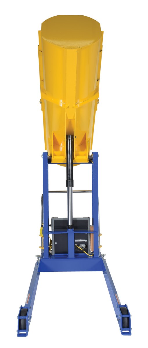 Steel Portable Hydraulic Drum Dumper 48 In. Dump Height 1,500 Lb. Capacity Blue / YellowThe Hydraulic drum dumper is what you need to dump heavy drums. Works with plastic, steel, and fiber drums. Dumper has a solid steel chute. This portable unit has casters with floor lock screws. All steel construction. Upper travel limit switch, emergency brass safety velocity fuse in cylinder, and vertical adjustment drum restraints are standard. Dumper is operated with a hand held control on a coil cord standard.