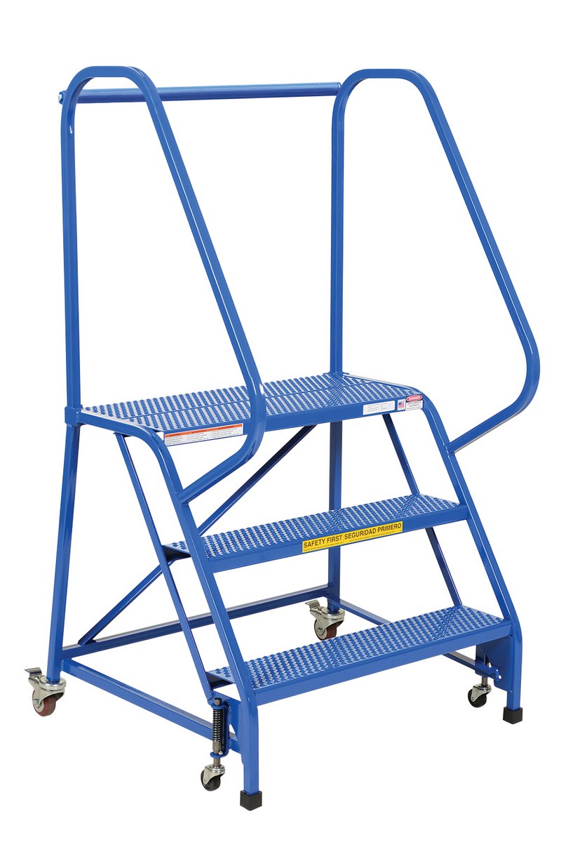 Steel Standard Slope Ladder 58 Degree 3 Perforated 30-1/4 In. Step Width 350 Lb. Capacity BlueThe standard slope ladder is a portable warehouse ladder for every-day use applications. Perforated steps, handrail included and welded square tubular steel construction with powder-coat blue finish. Rubber feet provided for floor protection. Unit has (2) two all directional spring-loaded swivel casters and (2) swivel casters with total locks. Ships fully assembled and ready to use.