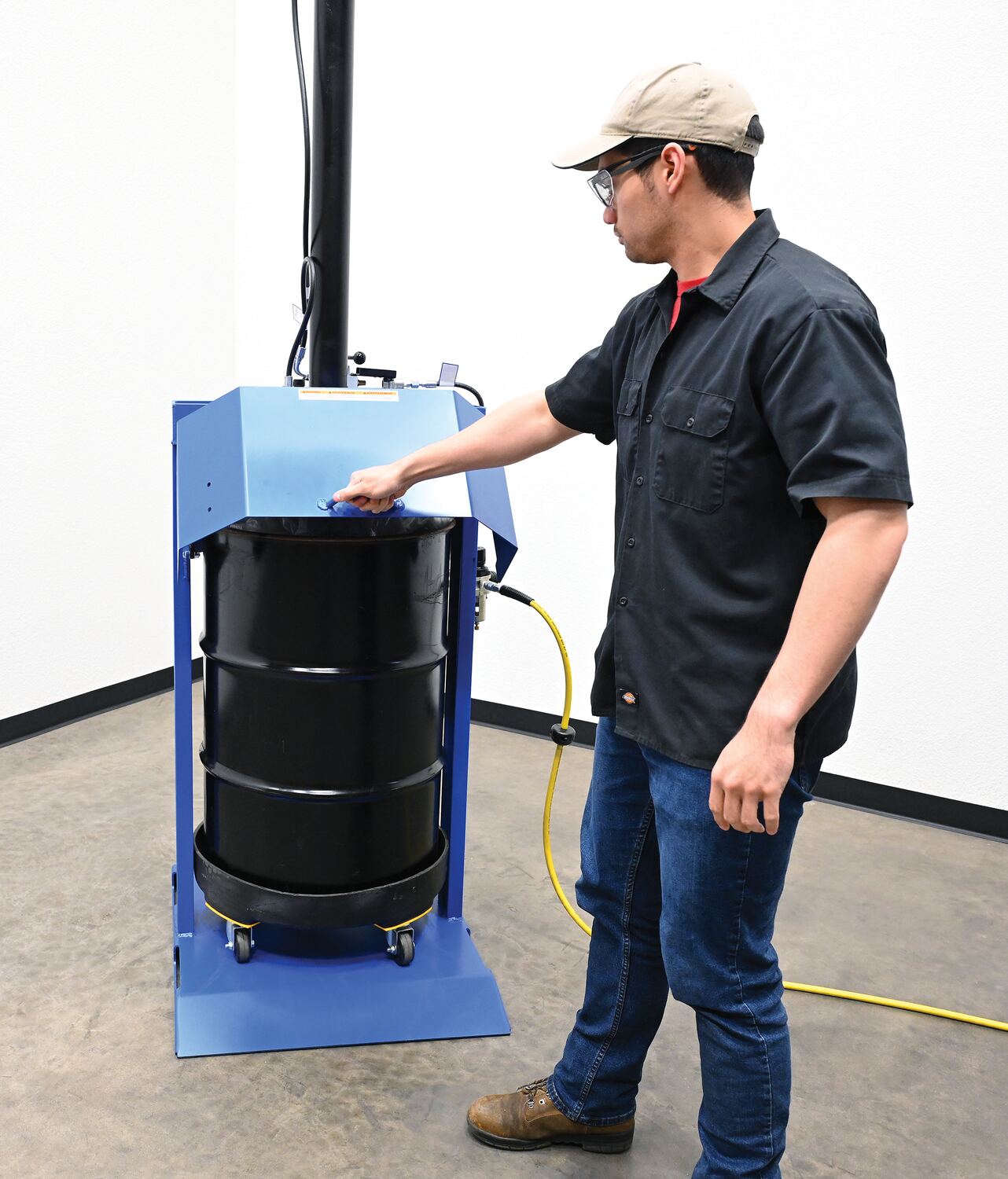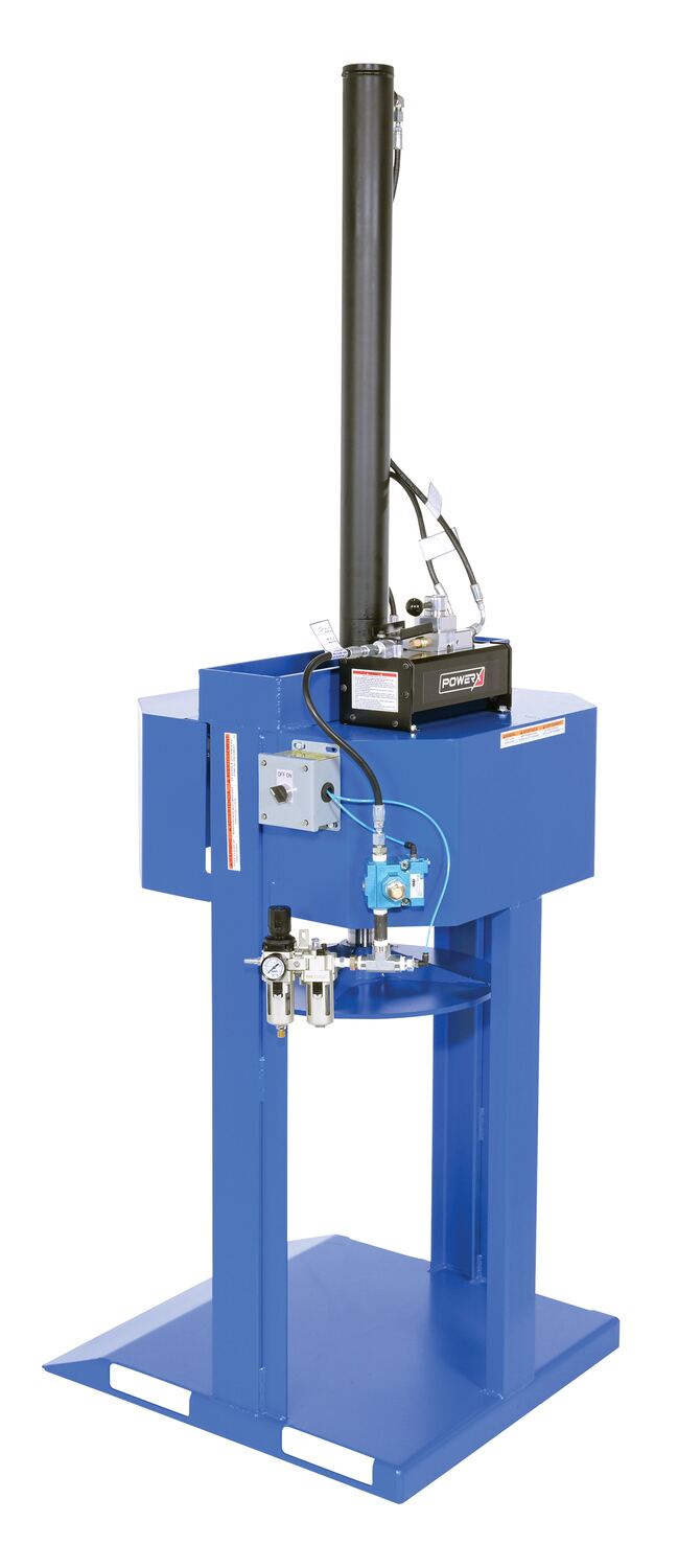 When material needs compacted, look no further than the drum compactor. A simple design with big results, this unit can compact material in a matter of moments. Utilizing a pneumatic input and controls with a hydraulic cylinder, the powerful down force enables the user to reduce the size of material waste. This design is specific for the use with 55 gallon drums. Painted finish minimizes abrasion and provides a smooth surface.
