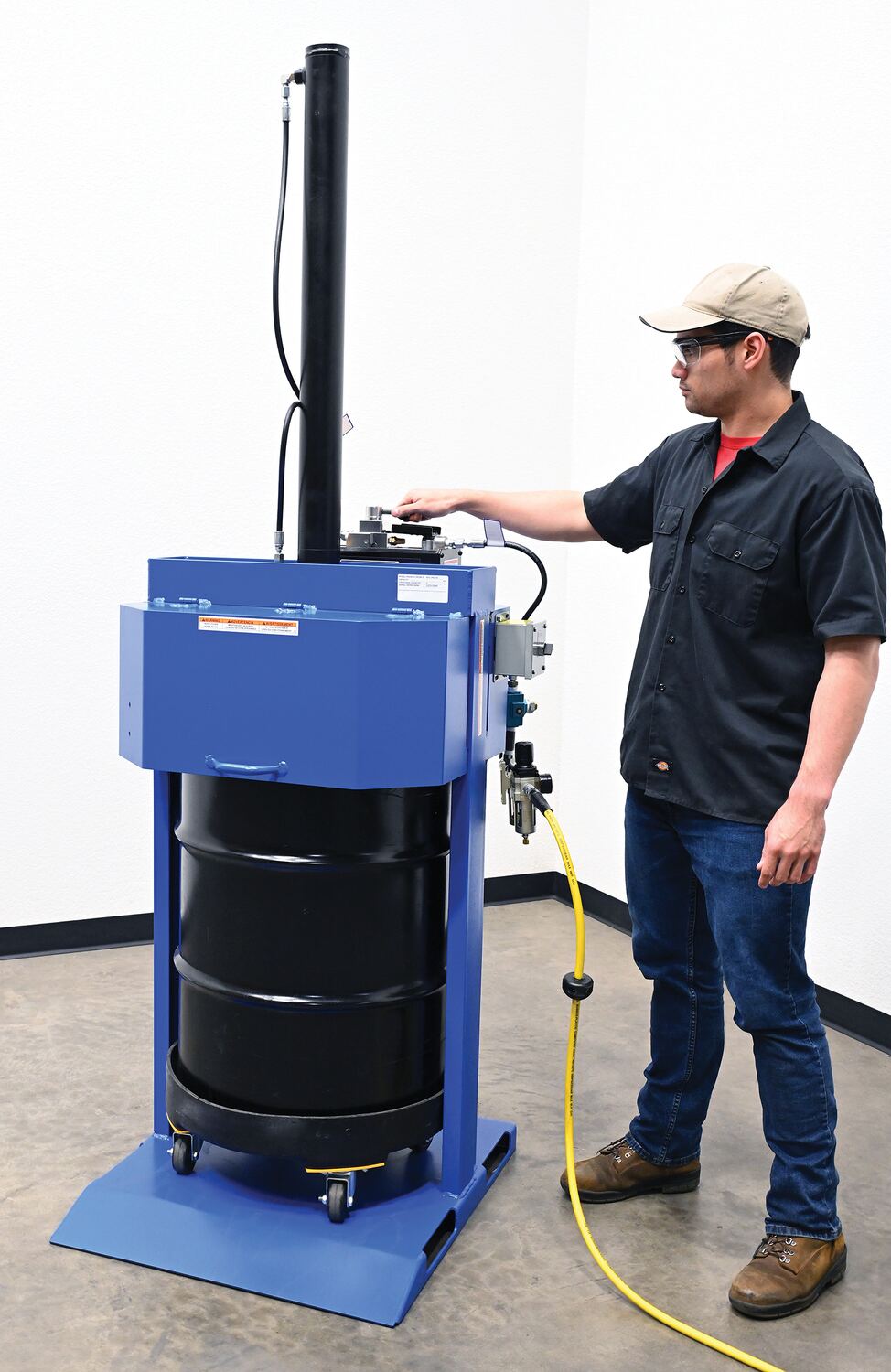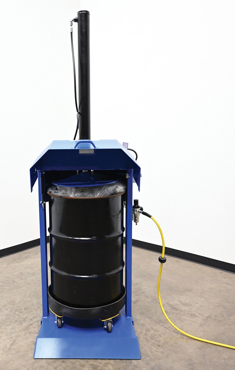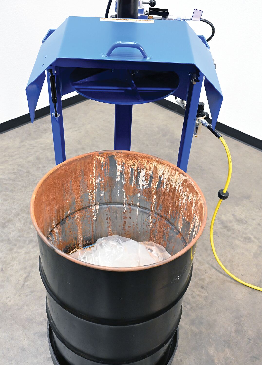 Steel Pneumatic Trash Compactor 55 Gallon 68 PSI Compaction Force BlueWhen material needs compacted, look no further than the drum compactor. A simple design with big results, this unit can compact material in a matter of moments. Utilizing a pneumatic input and controls with a hydraulic cylinder, the powerful down force enables the user to reduce the size of material waste. This design is specific for the use with 55 gallon drums. Painted finish minimizes abrasion and provides a smooth surface.