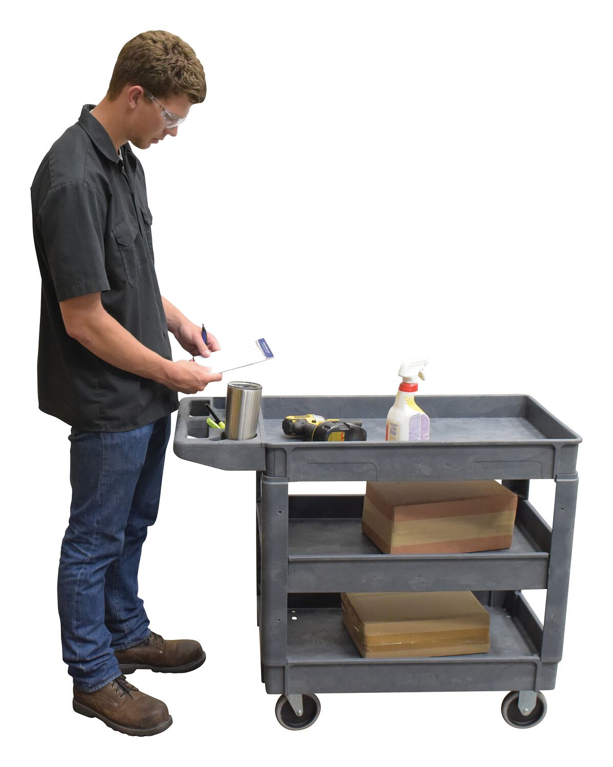 Plastic Utility Service Cart 3 Shelves 40 In. x 18-1/2 In. x 33-1/2 In. 550 Lb. Capacity GrayThis plastic utility service cart is constructed from durable yet lightweight structural foam plastic. Choose the three (3) shelf design to accommodate your application. Deep lips prevent parts from rolling off. Ideal for mail rooms, shipping docks, grocery stores, warehouses, and inventory rooms.