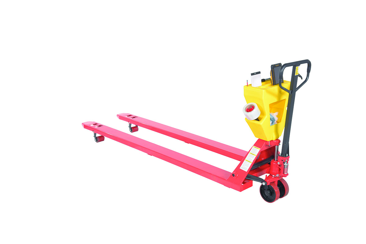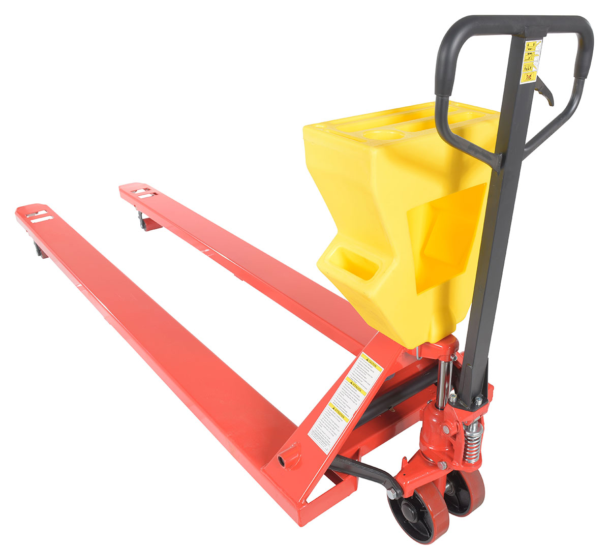 Steel/Plastic Pallet Truck 109-3/16 In. x 27 In. x 48 In. 4000 Lb. Capacity Red with Yellow P-CaddyA pallet truck with a storage caddy is the perfect bundle of two innovative products. The pallet truck has an ergonomically friendly design with a limited pulling force required, while the caddy allows the user to be more organized and efficient. With a strong powder coated steel construction, the pallet truck moves easily between areas. Nose wheels are located on the front edge of each fork to assist in clean pallet entrance and exit. A molded plastic design allows the caddy to be durable throughout consistent daily use. Installation hardware and instructions included.
