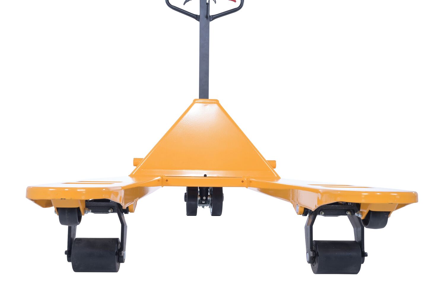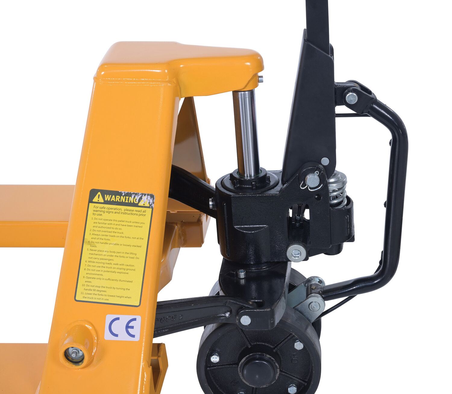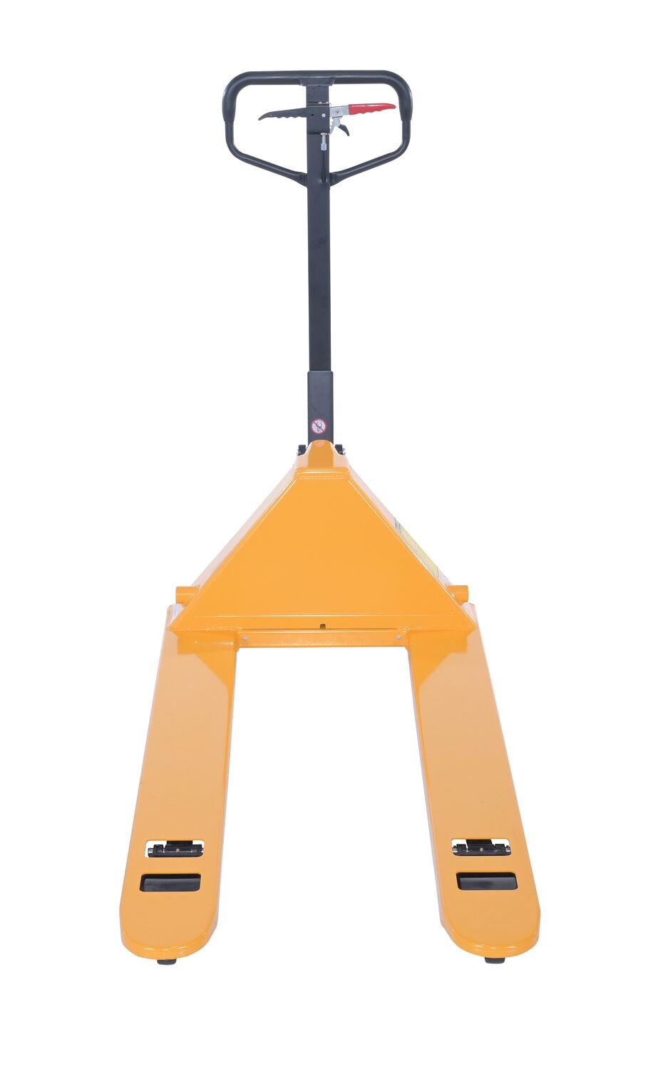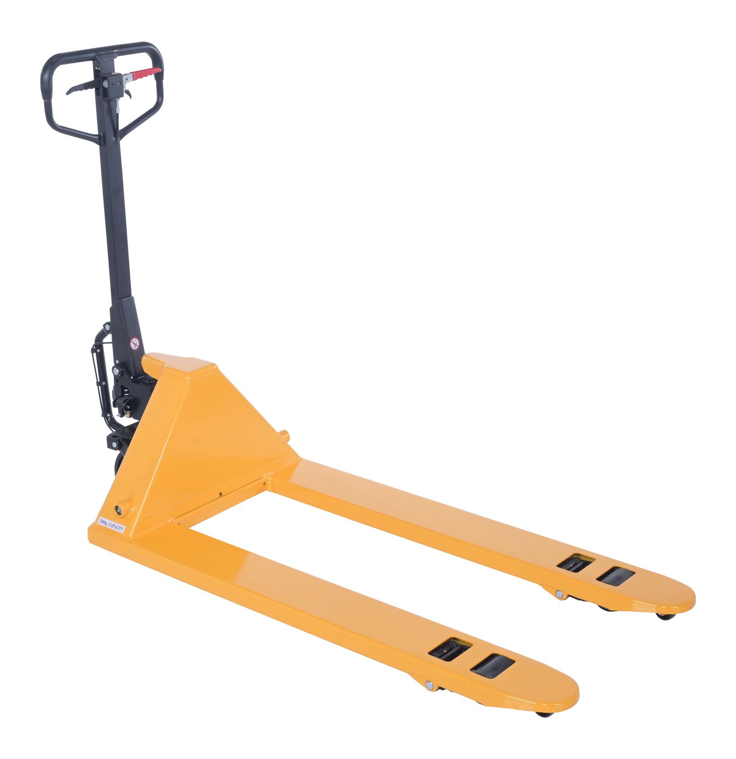 Steel Ergonomic Power Assist Pallet Truck 48 In. x 27 In. x 48 In. 5000 Lb. Capacity YellowThe Ergonomic power assist pallet truck is for anyone who has operated a fully loaded pallet truck and knows the most strenuous part is getting the wheels to start rolling. This pallet truck solves this back breaking problem. Pumping the handle of the pallet truck serves two purposes. First, it serves the traditional purpose of lifting the forks. Second, switch the power drive accumulator and by pulling the handle back, the pallet truck begins to roll automatically, thus reducing the pulling force.