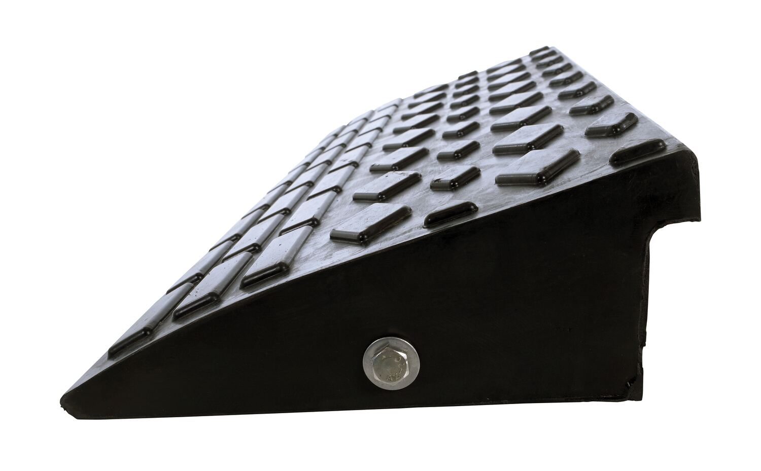 Heavy Duty Rubber Corner Ramp Rectangular 9-11/16 In. x 23-5/8 In. x 3-5/8 In. 4000 Lb. Capacity BlackThe rubber ramp consists of modular rubber that is versatile for use in many applications. Add round corner piece (sold separately) for a finished look. Tread surface pattern for better traction. Includes hardware for connecting ramps together. Heavy-duty molded rubber construction.