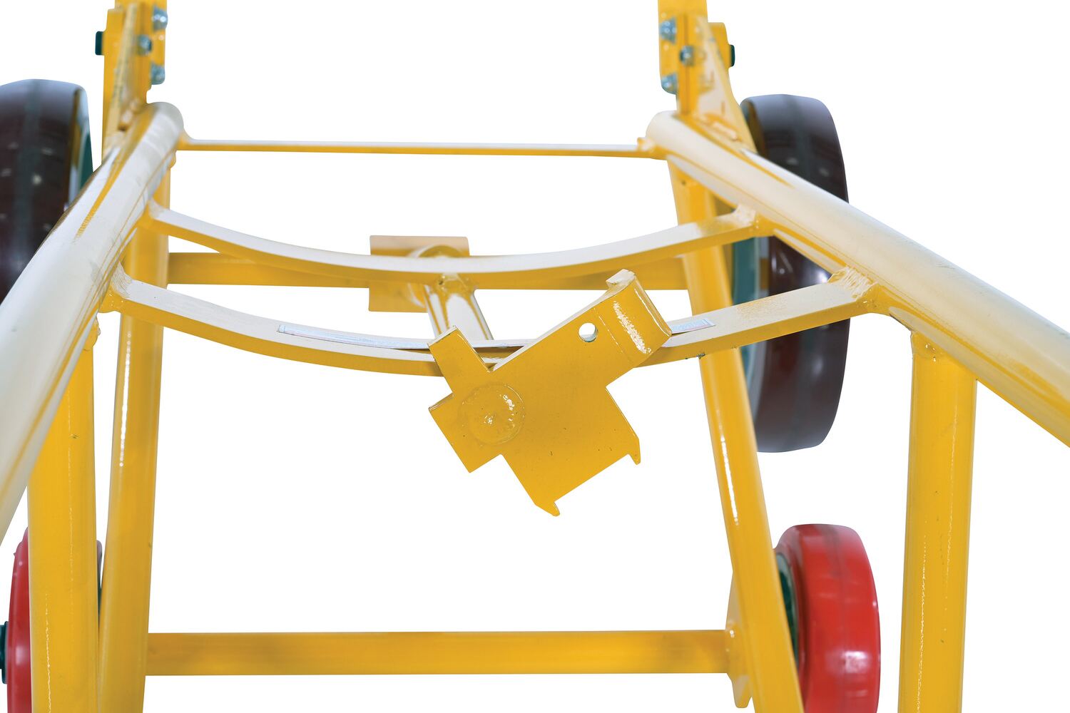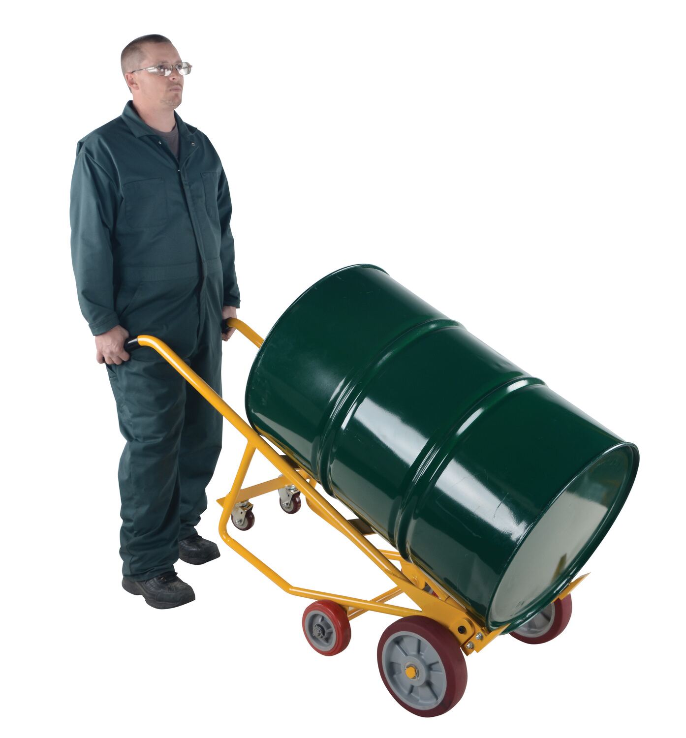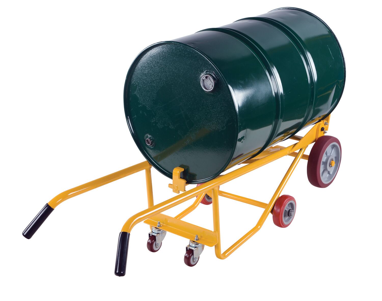 Steel Drum Truck Cradle With Poly On Poly 20-1/16 In. x 23-11/16 In. x 60-5/8 In. 1000 Lb. Capacity YellowThis multi-purpose drum truck/cradle is one of the most versatile drum trucks in the industry. This innovative product allows the operator to easily tip back the truck in order to transport drums ergonomically on four (4) wheels. Unit doubles as a drum cradle for storage and dispensing all in one. This unique design also allows the operator to place drums and retrieve off of a pallet. Standard with a wheeled undercarriage that positions the drum horizontally for drainage or storage. An integral self-storing bung wrench is standard. This attractive feature not only opens numerous drums, but helps to keep the drum snug on the truck. Powder coat finish.