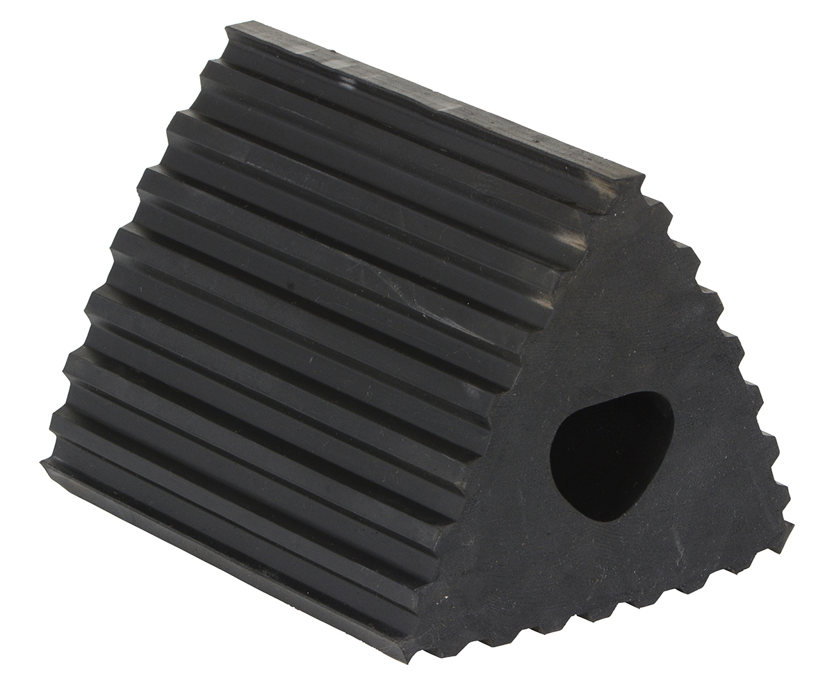 The rubber Wheel Chock is constructed of reinforced rubber to provide a sure grip on virtually any surface. The curved surface contours to fit tires. Rubber resists tearing, abrasion, ozone weathering, etc. The functional design is durable in all weather conditions.