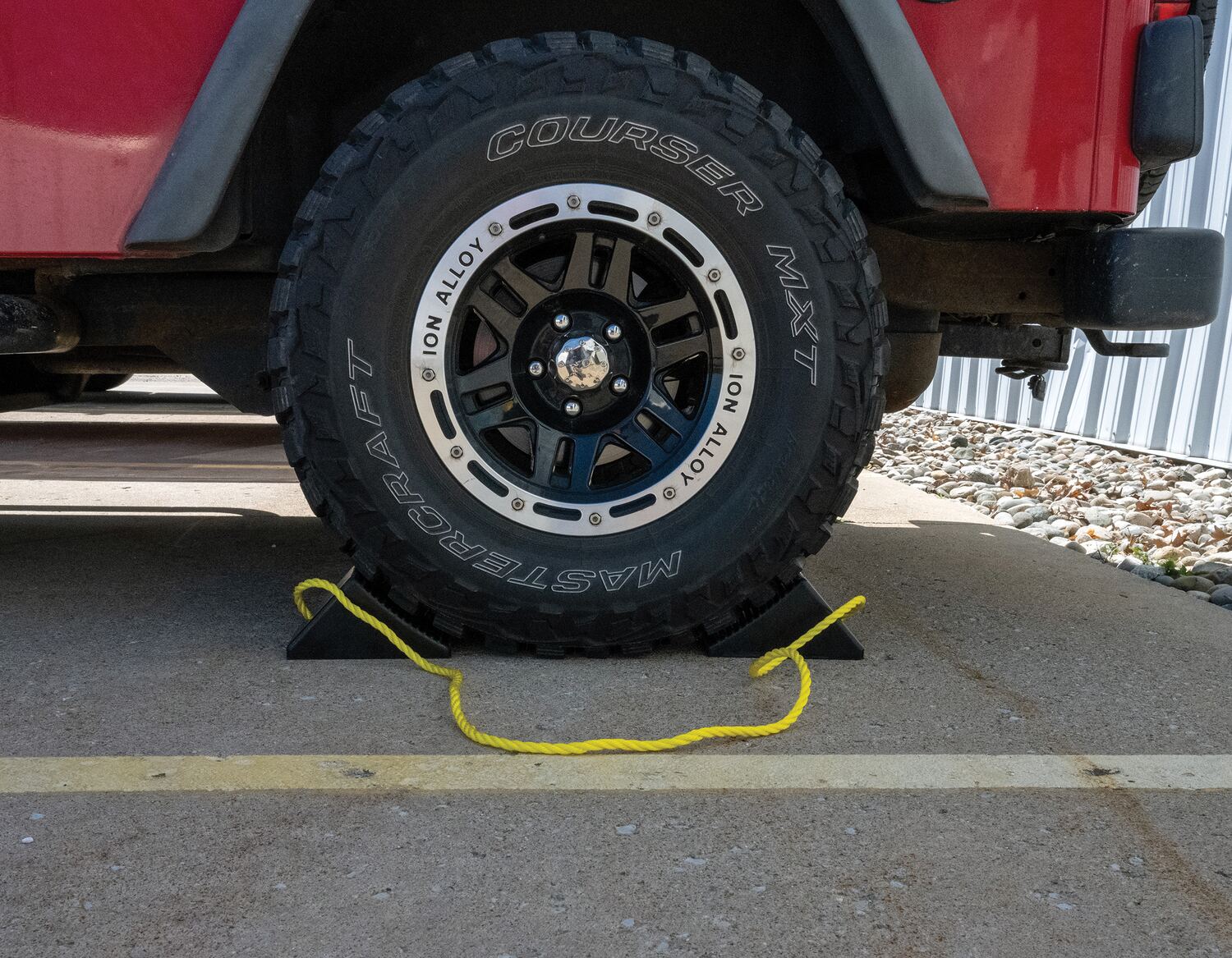 Molded Rubber Wheel Chock with Rope 8 In. x 56 In. x 4 In. BlackThe rubber wheel chocks are constructed of reinforced rubber to provide a sure grip on virtually any surface. The curved surface contours to fit tires. Rubber resists tearing, abrasion, ozone weathering, etc. The functional design includes a rope connected to the chock and is durable in all weather conditions.