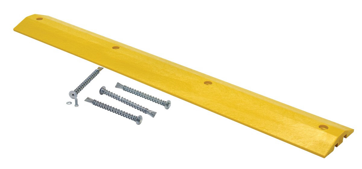 Plastic Speed Bump Heavy Duty Asphalt Hardware 72 In. x 10 In. x 2 In. YellowThe speed bump is ideal for a variety of parking areas, both inside and out. The speed bump helps to control drivers from injuring people and property. The unit can be installed/removed by one person resulting in smooth portability. The strong recycled plastic construction can be used where traffic is frequent and can hold up to the constant day to day harm from chemicals and sunlight. Features a dual cable channel. The HD asphalt kit includes anchors, bolts and washers. The HD anchor should be epoxied (epoxy not included) into the ground and then the speed bump is secured to that anchor with a bolt and washer.