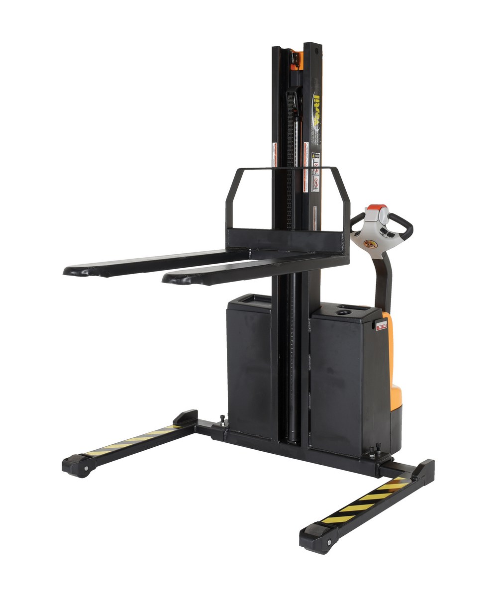 Steel Narrow Mast Stacker DC Powered 62 In. Raised Height Fixed Fork Adjustable Support Legs 2,200 Lb. Capacity Black / YellowThe narrow mast stacker is great for the shipping and manufacturing facilities. The stacker provides a fast efficient solution to loading and unloading products in closely confined areas. The stacker features a simple throttle design for lifting control, as well as, infinite forward and reverse speed adjustments. The unit drives on poly on steel steering and load wheels, which provide excellent maneuverability. A battery charger, gauge and horn are included. Models are available with fixed or adjustable forks as well as fixed or adjustable leg supports.