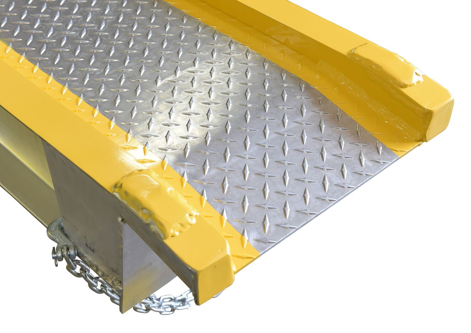 Vehicle ramps are designed to provide a safe means for driving vans, pickup trucks and passenger vehicles between ground level and elevated building entrances. These vehicle ramps include chains and hooks to firmly secure them to loading docks. Ensure that vehicles possess the ground clearance necessary to ascend or descend the ramp. Each ramp is able to accommodate wheels that are 14" wide or smaller. These robust aluminum ramps are sold in pairs.