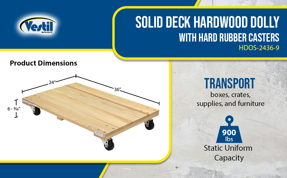 | Hardwood Solid Deck Dolly 36 In. x 24 In. x 6-3/16 In. 900 Lb. Capacity | Uniform Static Capacity (lb.): 900 Deck Width (in.): 24 | 33 |